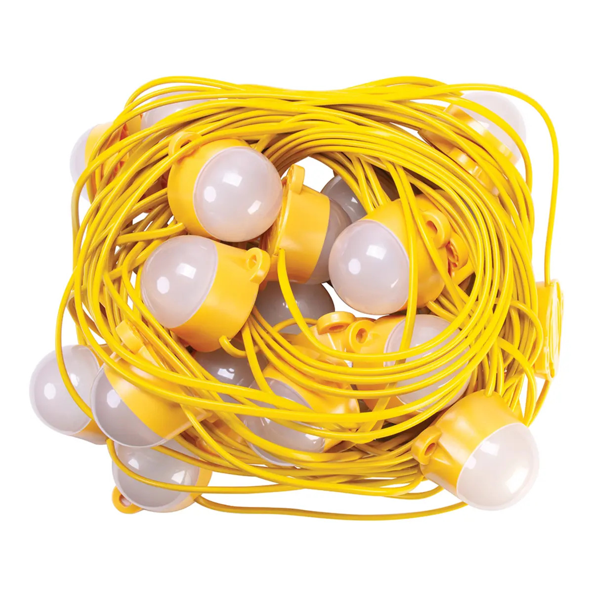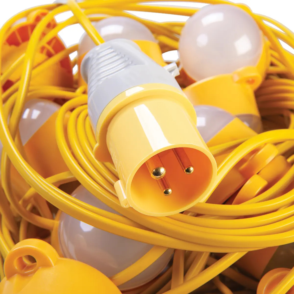 Essential lighting for applications throughout the work area, these festoons have sealed modules so the lens can't unscrew, including built-in mounting points. Heat and glass-free for safety. Diffused lens reduces light glare. Features 20 modules 2.2m apart. Light spread 180°. Output 100W, 8000 Lumens. Note: 110V suitable for on-site use. 230V suitable for domestic use only. Essential lighting for industrial & site applications Sealed modules with built-in mounting points eliminate unscrewing of lens Heat & glass-free diffused lens for safety & reduced light glare Features 20 modules 2.2m apart with 180° light spread
