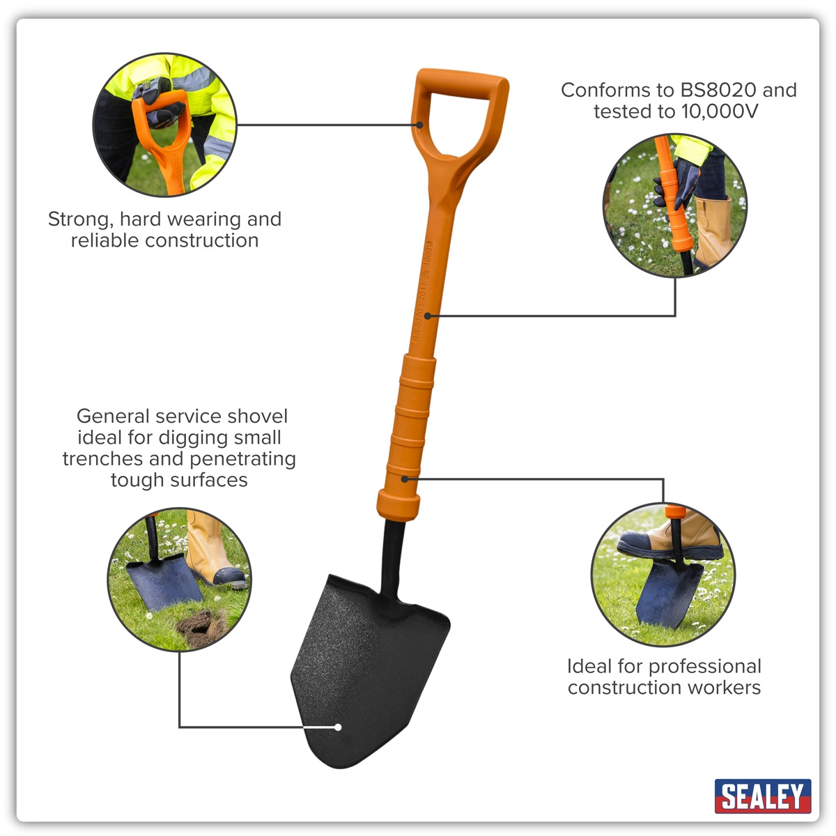 GENERAL SERVICE SHOVEL - ideal for digging small trenches and penetrating tough surfaces. SAFETY - Conforms to BS8020 and tested to 10,000V. INSULATED - Designed for use when working around electrical wires and equipment. SPECIALISED - Ideal for professional construction workers. HEAVY-DUTY - Strong, hard wearing and reliable construction.