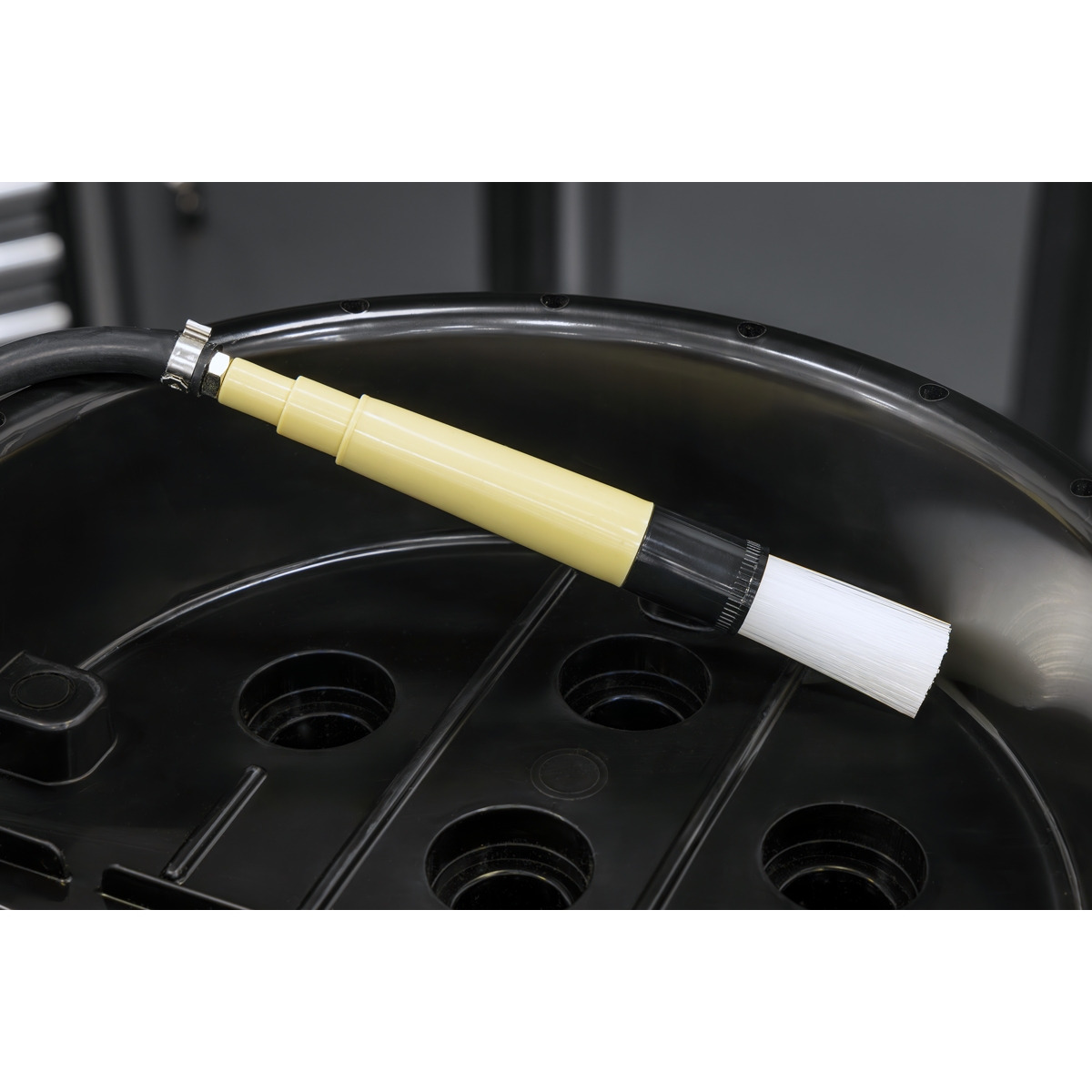 PORTABLE - Lightweight and easy to move around the garage. EFFECTIVE - Great for parts cleaning with any non-corrosive, water-based cleaning solutions. ADAPTABLE - Simple to use with any 14L bucket, such as Sealey Model No. BM16 (bucket not included). DIVERSE - For degreasing and cleaning small parts and tools with the hard bristle brush. EFFICIENT - Unique channel drainage system to catch waste material and the variable speed pump sits in the bucket.
