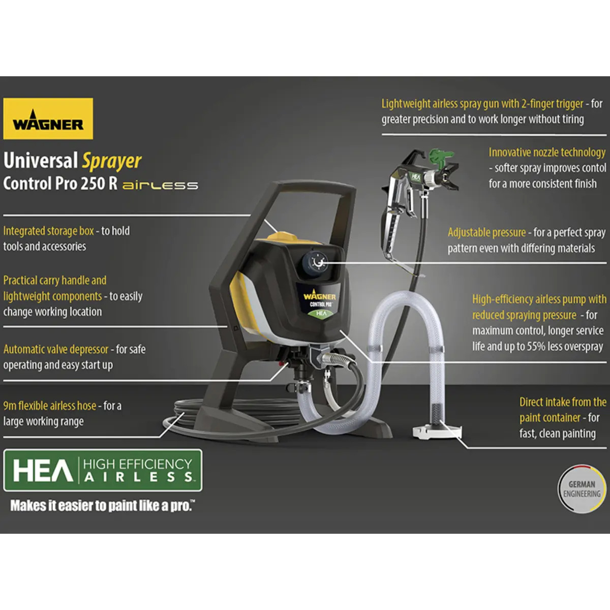 A direct intake system allows paint containers to be connected straight to the sprayer, speeding up preparation and cleaning. Compatible with solvent and water-based paints, varnishes, wood preservatives, emulsion and latex paints, the 250R is a versatile solution for walls, ceilings, fences and larger surface areas. An integrated storage box keeps accessories organised, and the 9m flexible hose provides a generous working range.