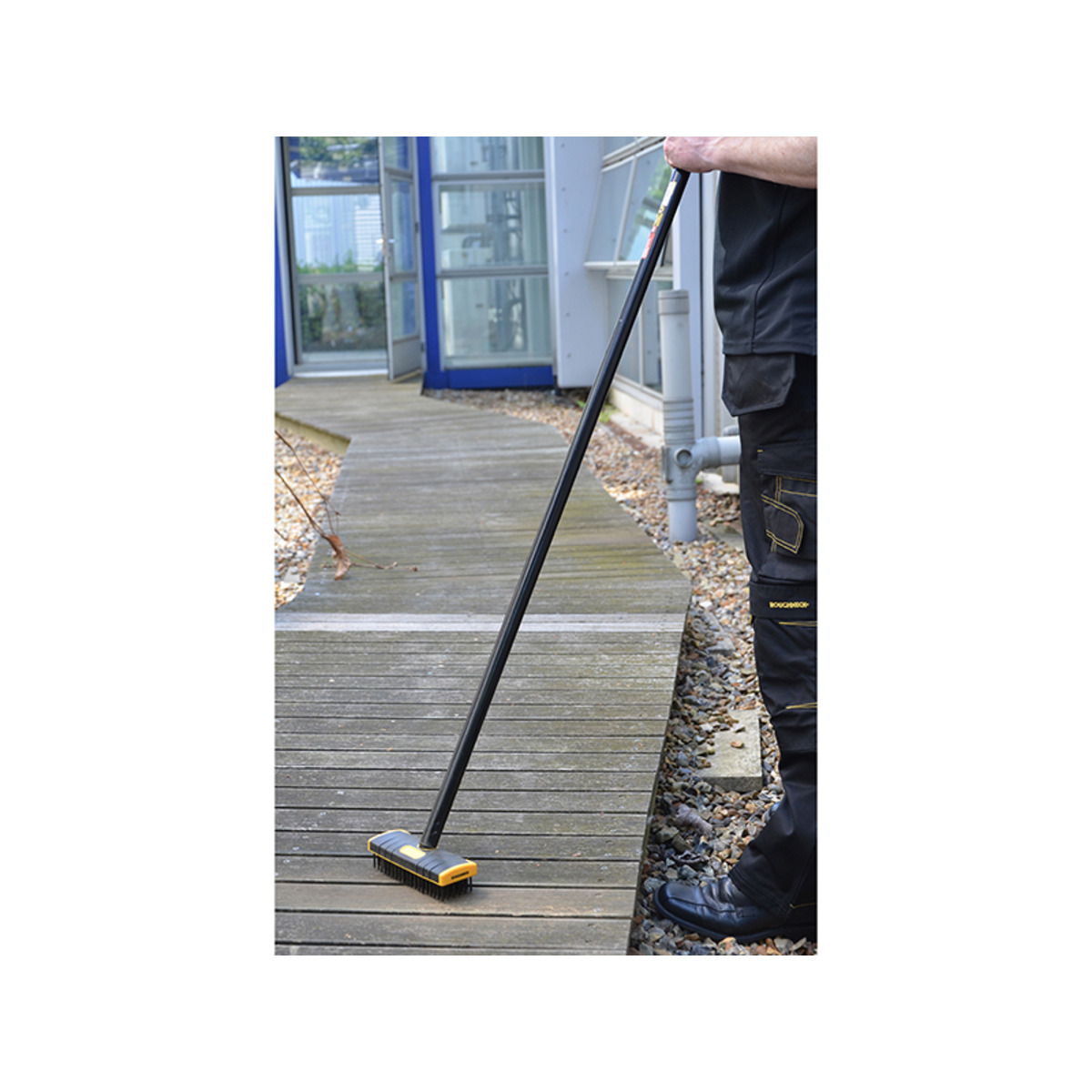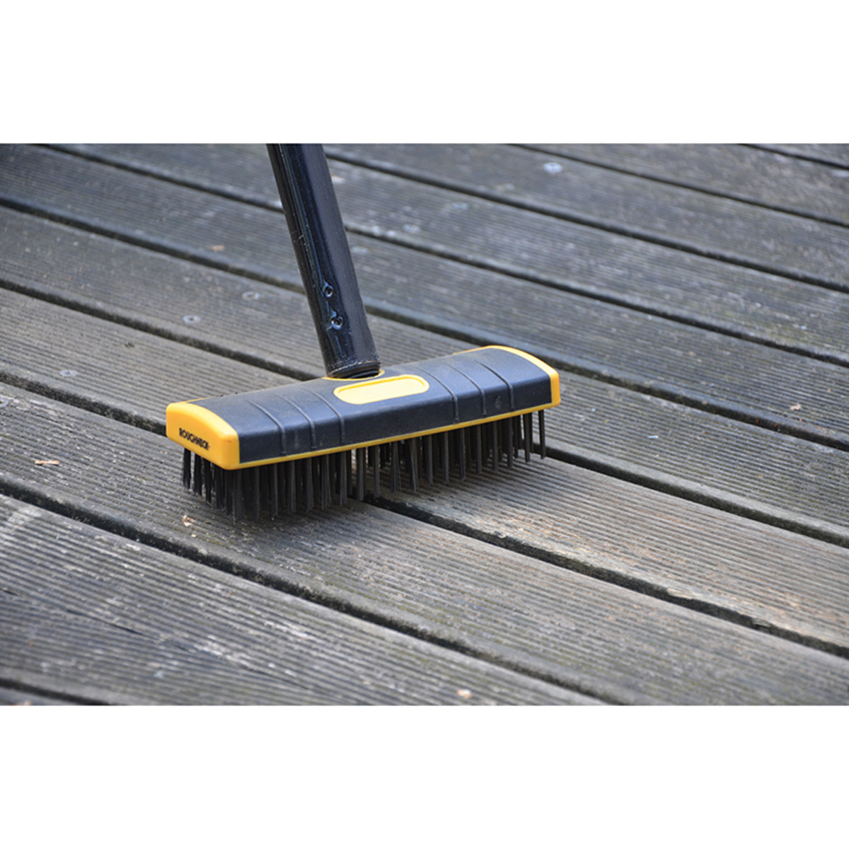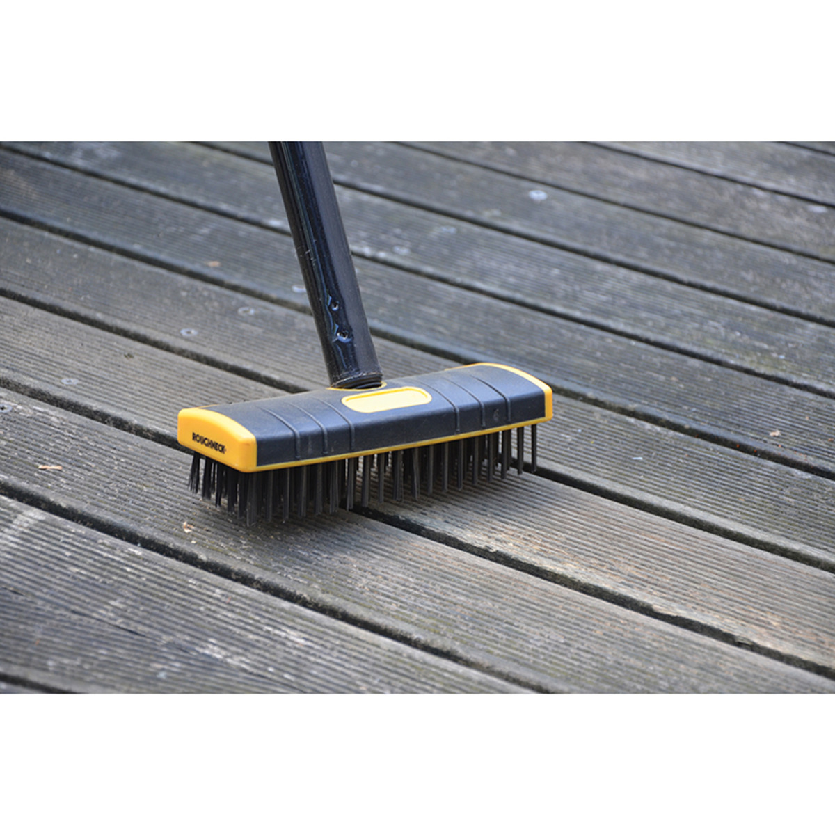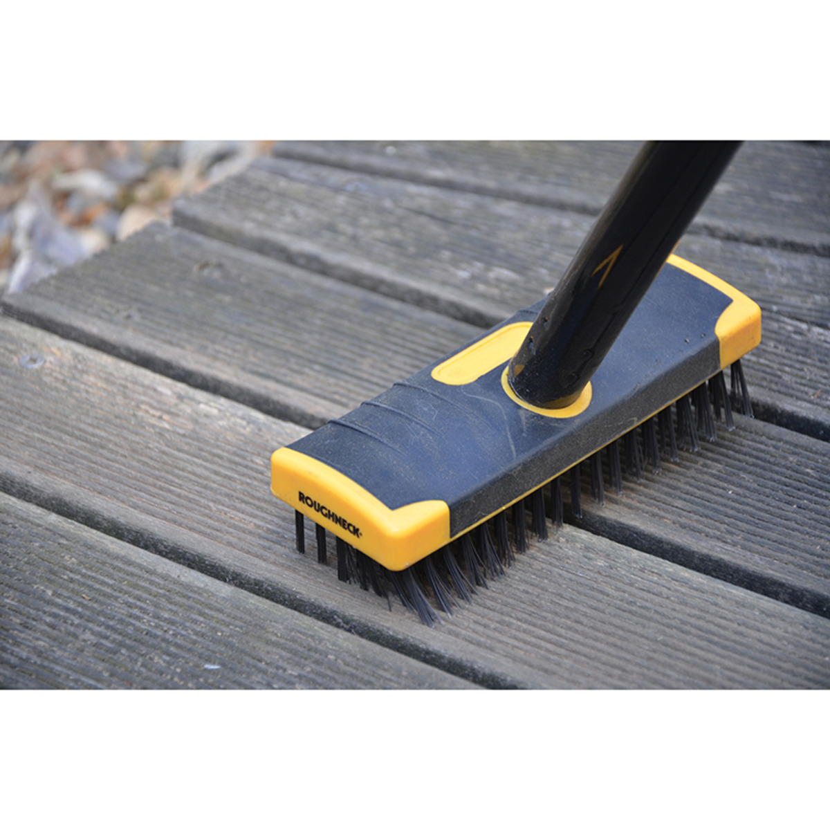 The Roughneck Heavy Duty Scrub Brush can be used as a hand brush or with the 52-080 steel handle. It has 19 sets of large carbon steel bristles for general purpose use. It is ideal for scrubbing decking prior to treatment and cleaning patios and concrete surfaces.