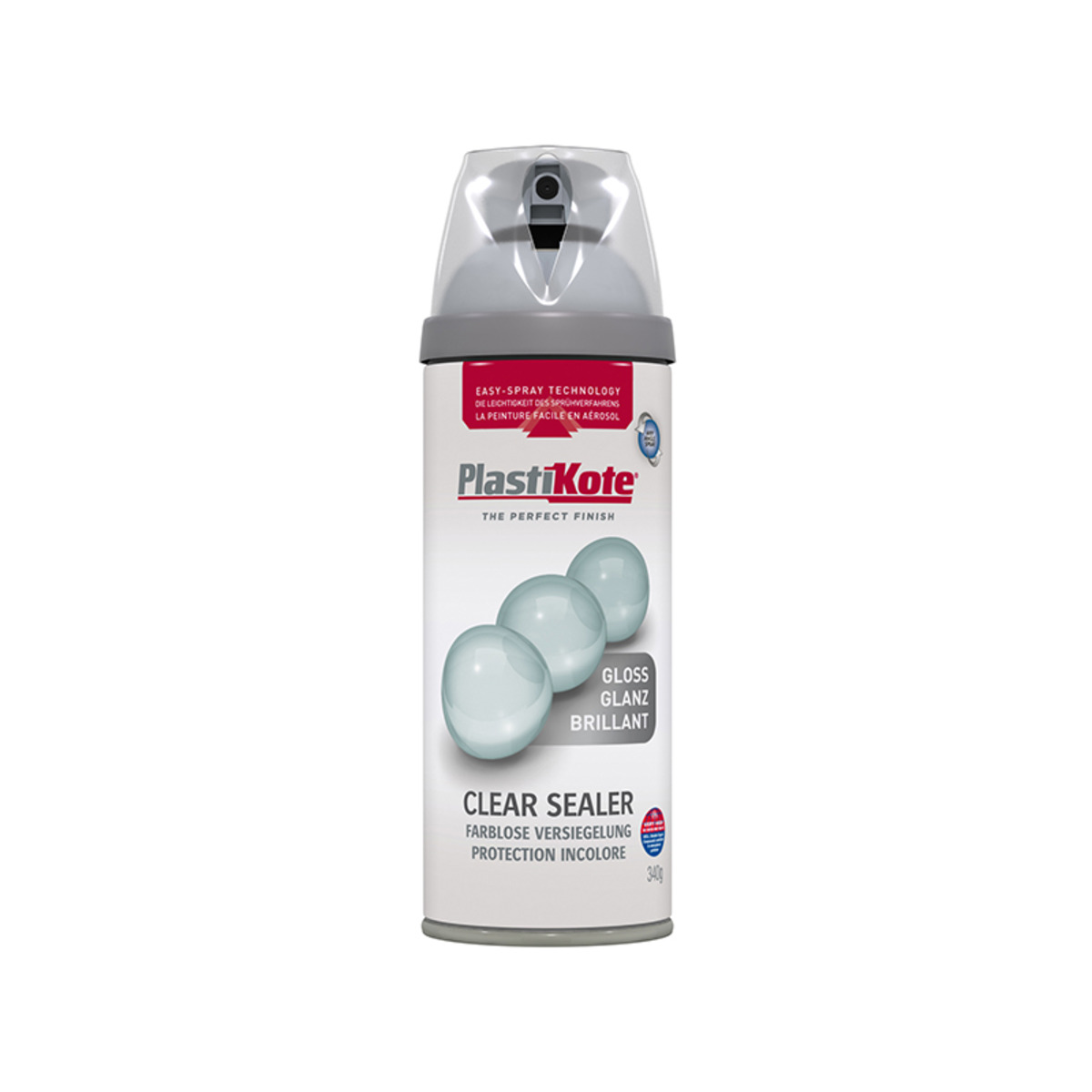Pack Size: 400ml.The PlastiKote Twist & Spray Clear Sealer allows you to change the sheen to Gloss, Satin or Matt after spraying a colour and to give additional protection against weather, heat, cold, acid, alkali, corrosion and water with a sealer formula for enhanced and consistent coverage. It is UV absorbent, water resistant, protects against rust and will not fade or yellow.