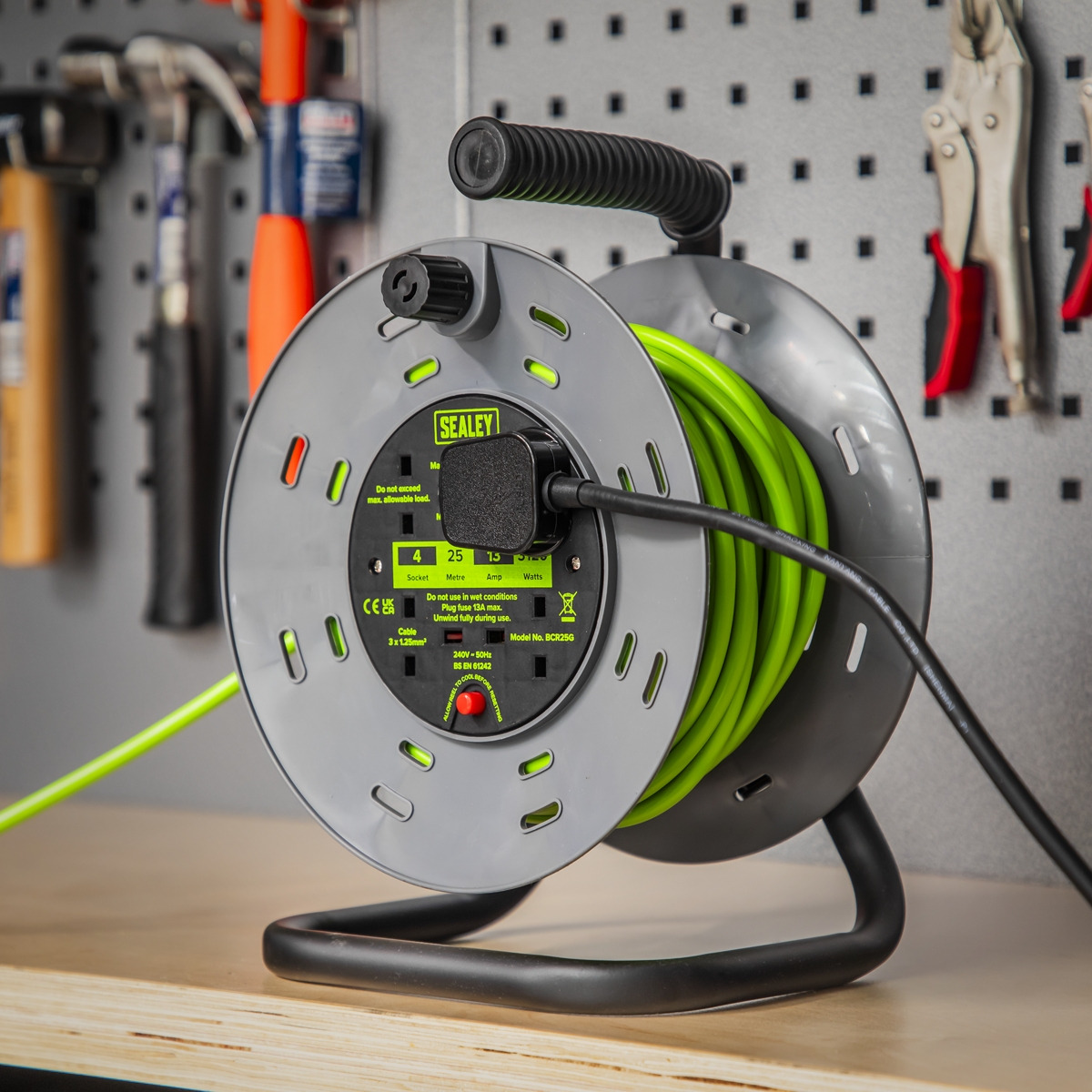 Sealey BCR25G 25m Cable Reel with Thermal Trip 4 x 230V - Hi-Vis Green