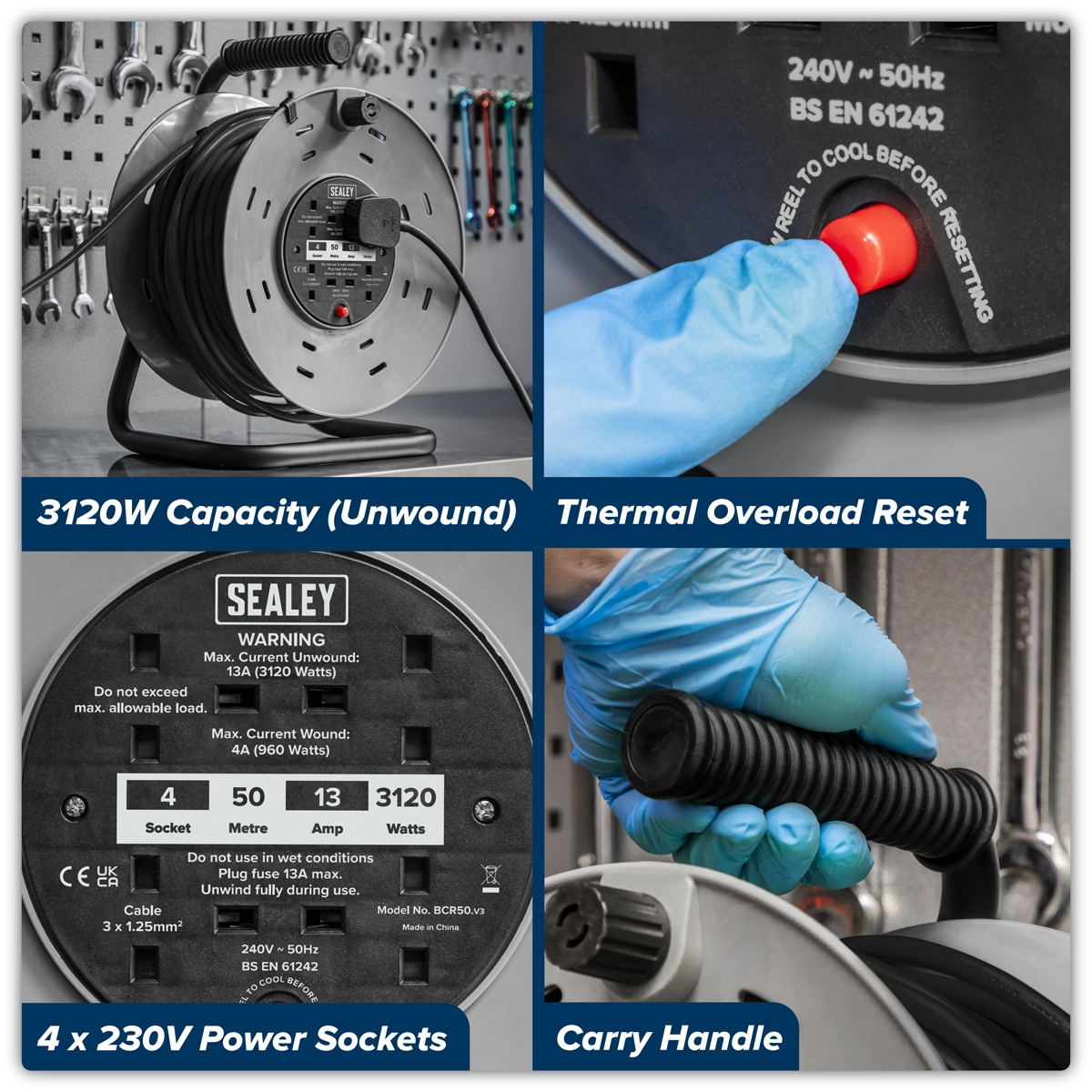 Sealey BCR50 50m Cable Reel with Thermal Trip 4 x 230V