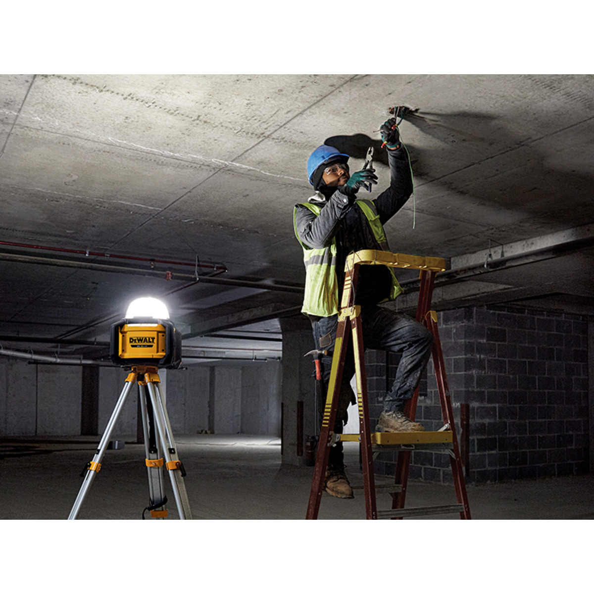 The DEWALT DCL074 XR Tool Connect™ Area Light with 3 brightness settings, up to a maximum of 5000 lumens. It has a 360° beam pattern; the precision engineered lens with 150 flutes delivers a bright even beam pattern to illuminate entire working space. Fitted with a robust roll cage for increased durability, designed to withstand tough job site environments.