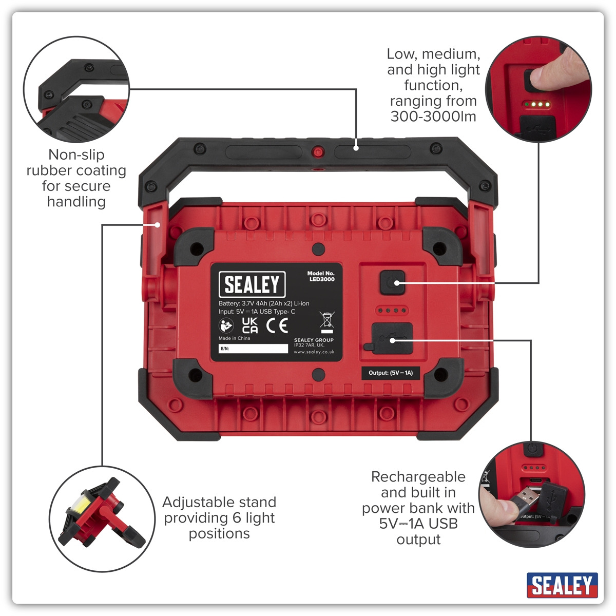 Sealey LED3000 Rechargeable Portable Floodlight & Power Bank 30W COB LED