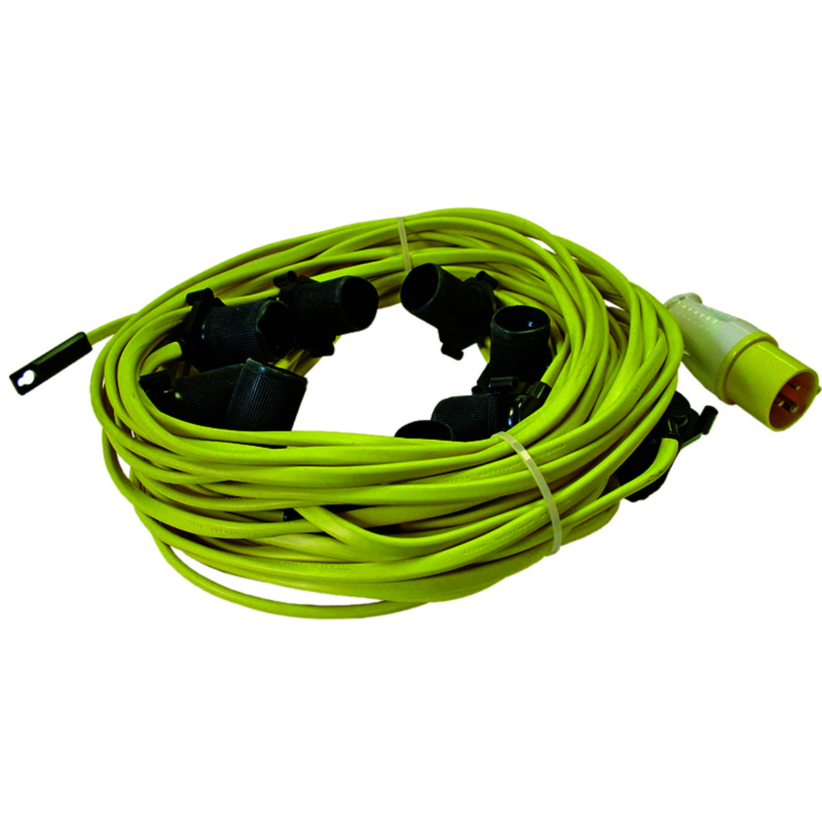 The Faithfull Festoon Light Set, comes on a 22 metre arctic cable supplied with 10 x ES GLS rough service bulbs (110V), each bulb is protected by a lightweight yellow plastic cage. These festoon lights will provide a very effective solution to illuminating a large area on site by hanging the lights in one room and to another across a landing, etc.