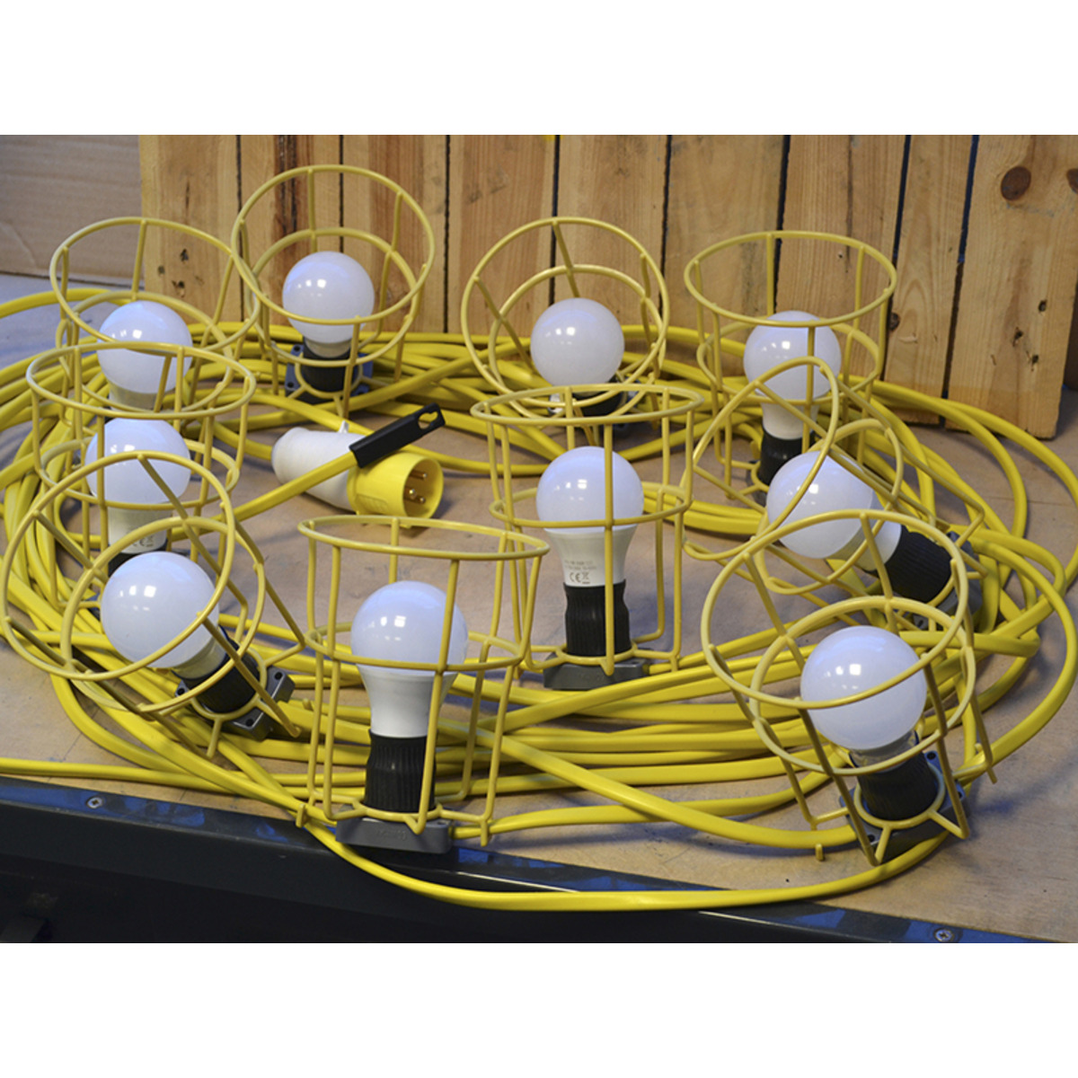 The Faithfull LED Festoon Light Set, comes with a 22 metre arctic cable supplied with 10 x bulbs (110V), each bulb is protected by a lightweight yellow plastic cage. These festoon lights will provide a very effective solution to illuminating a large area on site by hanging the lights in one room and to another across a landing, etc.
