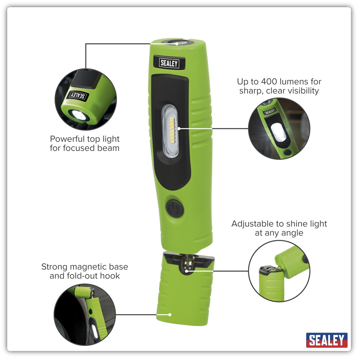 Unique and innovative 360° swivel and tilt function enables the light source to be positioned in any direction. Exclusive patented design owned by and registered to Sealey. 4W SMD LED providing up to 400 lumens output with 120° spread of light, illuminating the whole work area. Includes an additional high power 3W LED directional torch. Features two swivel hooks and three rubber covered magnets, two on the rear and one on the end, which allow hands-free operation. High quality 2.2Ah lithium-ion battery for longer life, no memory effect and a much slower discharge than traditional Ni-MH batteries. Micro USB charging port. Supplied with USB cable. Operating Time Side (High/Low)/Top: (3/7)/8hr. Charging Time: 3.5hr. Min./Max. Length: 255/270mm.