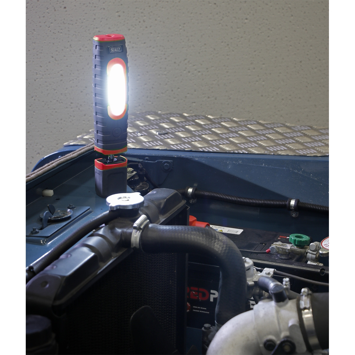 Unique and innovative 360° swivel and tilt function enables the light source to be positioned in any direction. Exclusive patented design owned by and registered to Sealey. 15W SMD LED providing up to 1000 lumens output with 120° spread of light, illuminating the whole work area. Includes an additional high power 3W LED directional torch. Features two swivel hooks and three rubber covered magnets, two on the rear and one on the end, which allow hands-free operation. Two high quality 3.7V 2.6Ah lithium-ion batteries in parallel for up to 15 hours run time. Micro USB charging port. Supplied with USB cable. Operating Time Side(High/Low)/Top: (3/12)/15hr. Charging Time: 7hr. Min./Max. Length: 256/276mm.
