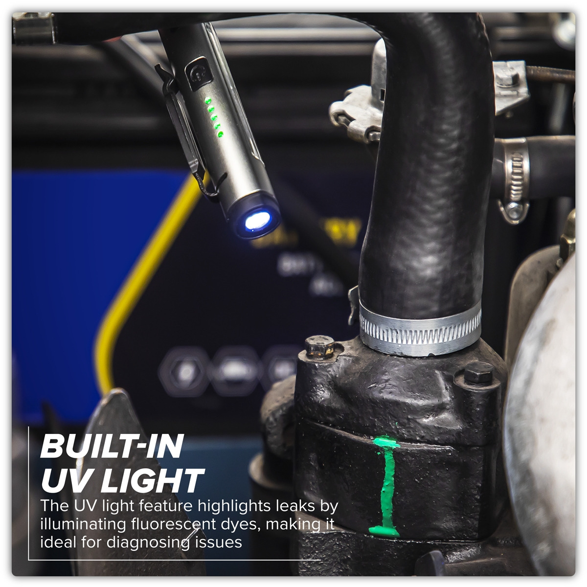 - Produces an ultraviolet light for fault finding with fluorescent dyes used in leak detection.