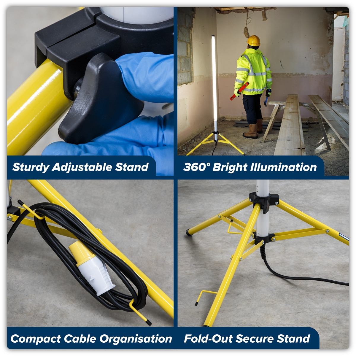 360° Slim standing floodlight to illuminate the whole area whilst working. SMD LED 60W light producing 6600 lumens. Foldable tripod stand for easy storage. Includes 110V 16A 2P+E plug and 3m cable.
