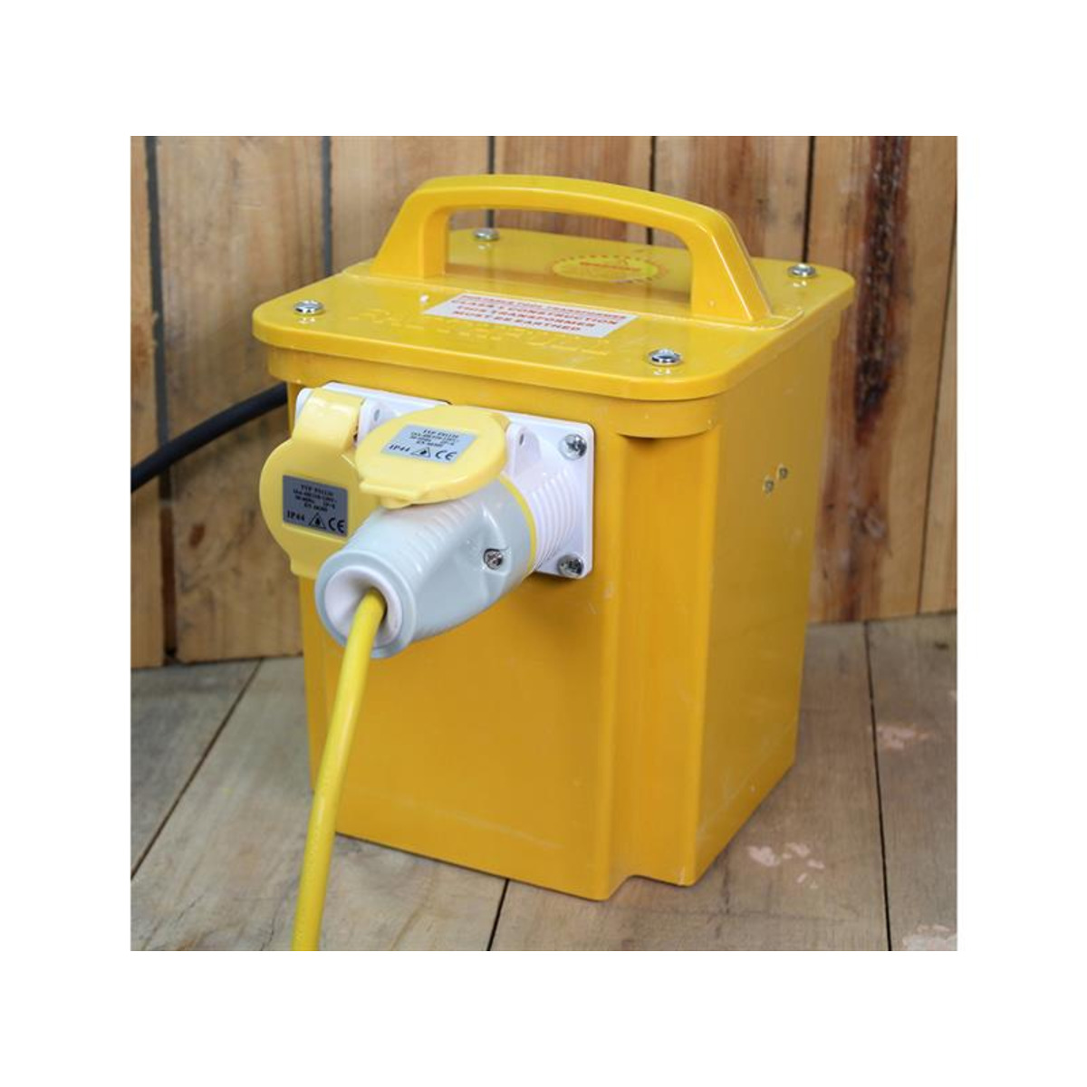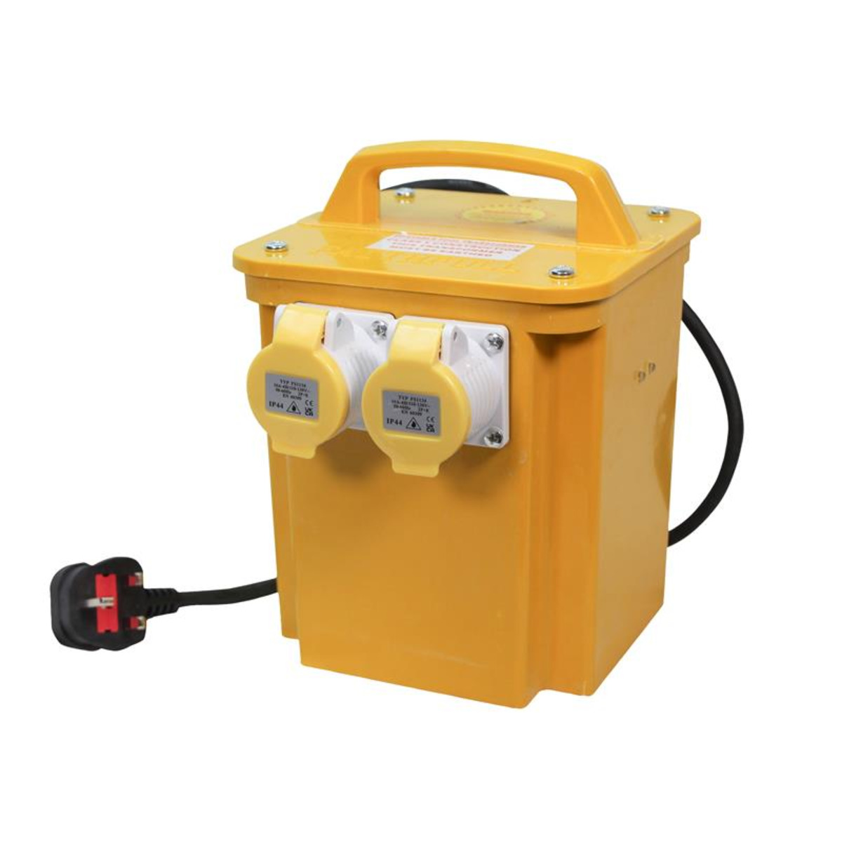 The Faithfull Power Plus TRAN33A is a 16 amp 3.3kVA Twin Outlet transformer, ideal for site use. It has a heavy-duty GRP weatherproof case which is rated to IP44. It has a resettable thermal overload protection and is fitted with BS approved 13 amp plug. It also includes a unique blue LED ‘Power On’ indicator, which provides the user with an ‘at a glance’ confirmation that the unit is live. This model has 2 x 110V 16 amp sockets. NOT suitable for use on 110V heaters where a continuous load is required.
