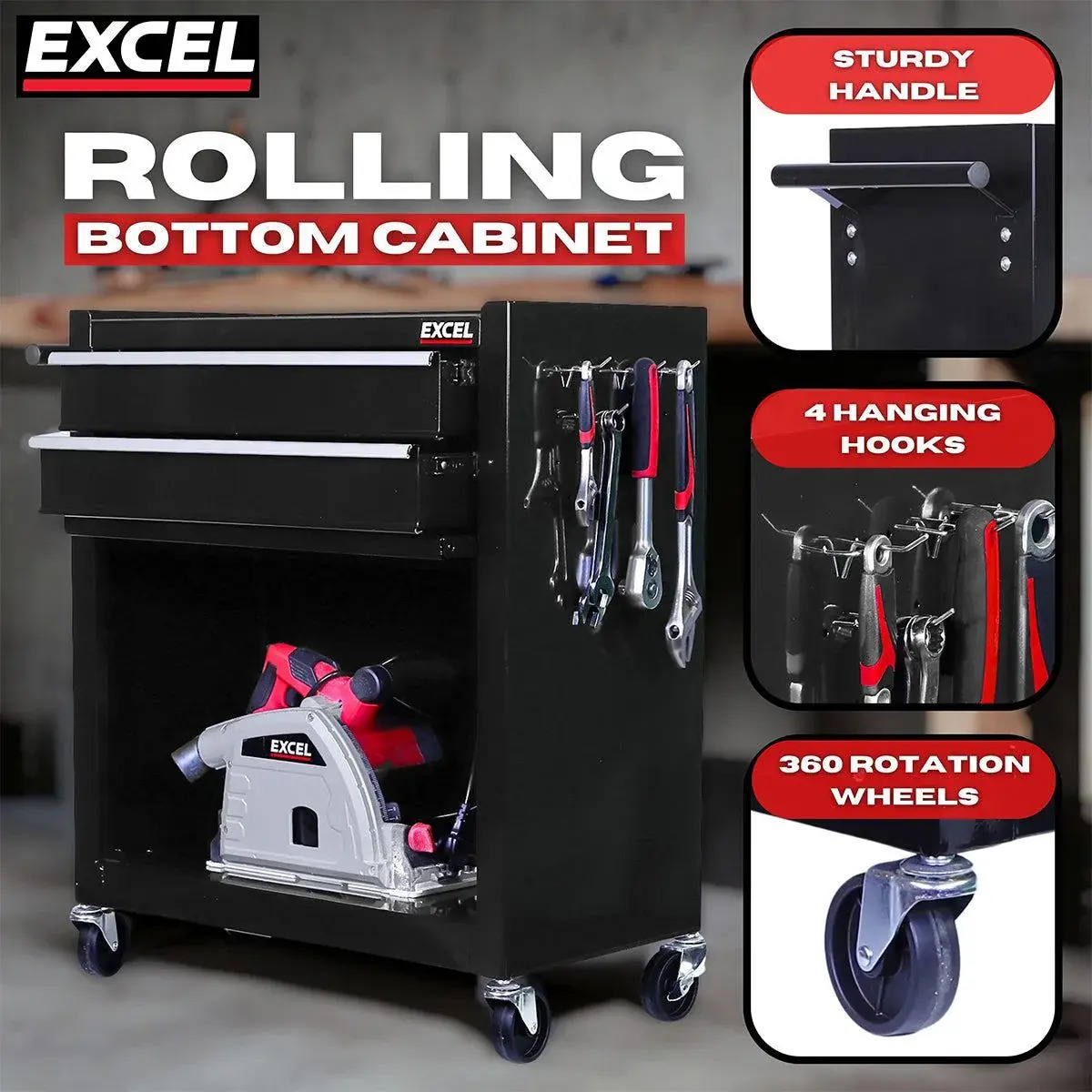 Excel Mechanics 8 Drawer Tool Box Chest & Roller Cabinet is a spacious and versatile storage solution for all your mechanic tools. With a total of 8 drawers, it offers ample space to organize your wrenches, screwdrivers, sockets, and other essential tools. The chest is made of sturdy steel for durability and rust resistance. The super smooth draws glide open effortlessly, reassuringly clicking into the fully open position - everything seems to fit together perfectly. The top chest / toolbox section can be lifted from the roller cabinet giving you flexibility and portability. The security-lock and bar locks in this section keep your belongings secure. The cabinet comes with customisable hooks that can be positioned according to your needs. The hooks are ideal for hanging larger tools, or giving you quick access to frequently used equipment. The smooth castor wheels make manoeuvring the cabinet around a garage or workshop a breeze.