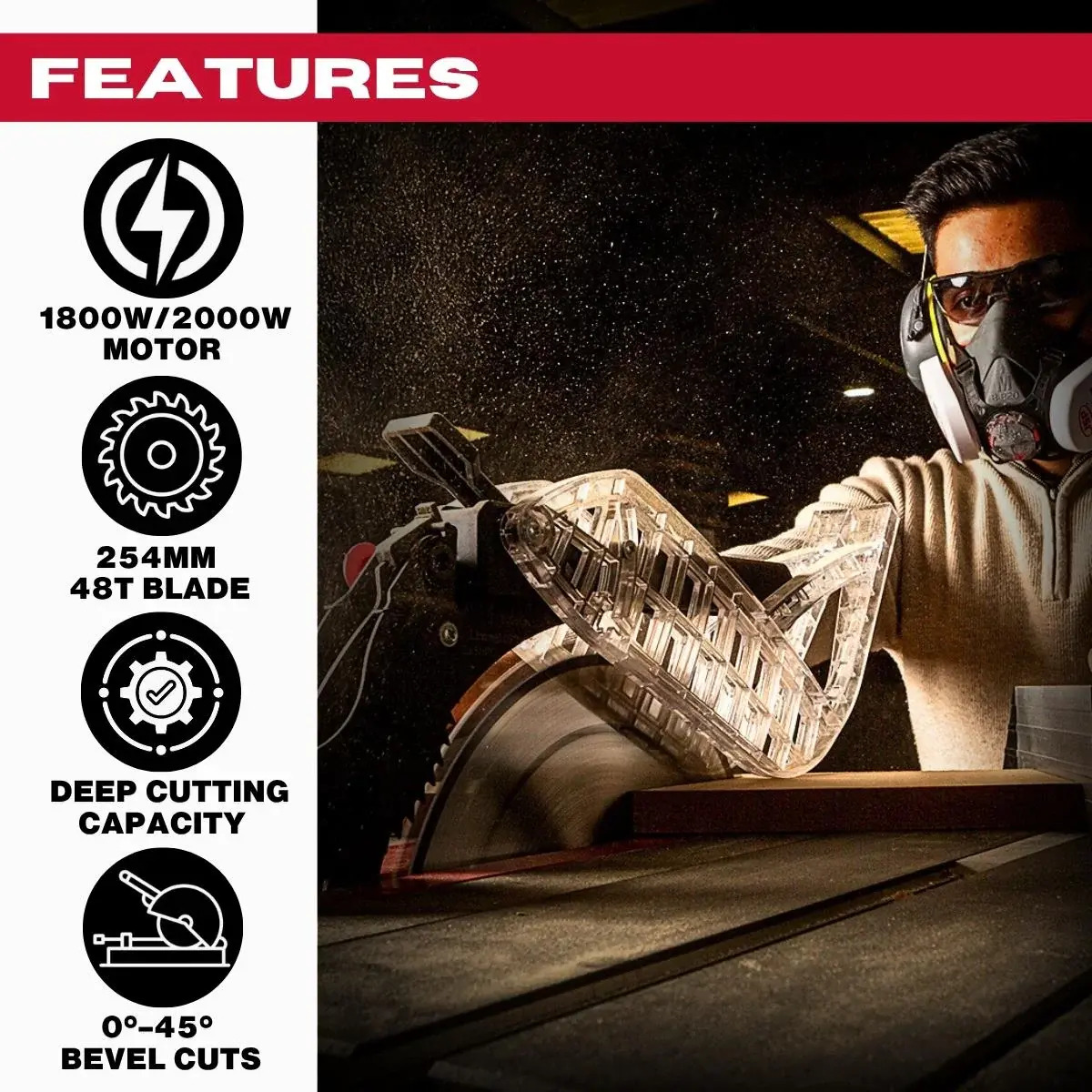 Powered by an 1800W continuous-duty motor (with up to 2000W intermittent output), it drives the 254mm 48-tooth blade smoothly through solid timber and sheet materials. The blade tilts from 0° to 45° for clean bevel cuts, while the extendable table gives you extra support when working with wider boards. Supplied with a rip fence, mitre gauge and full safety equipment, its a well-rounded table saw thats ready to work straight out of the box.