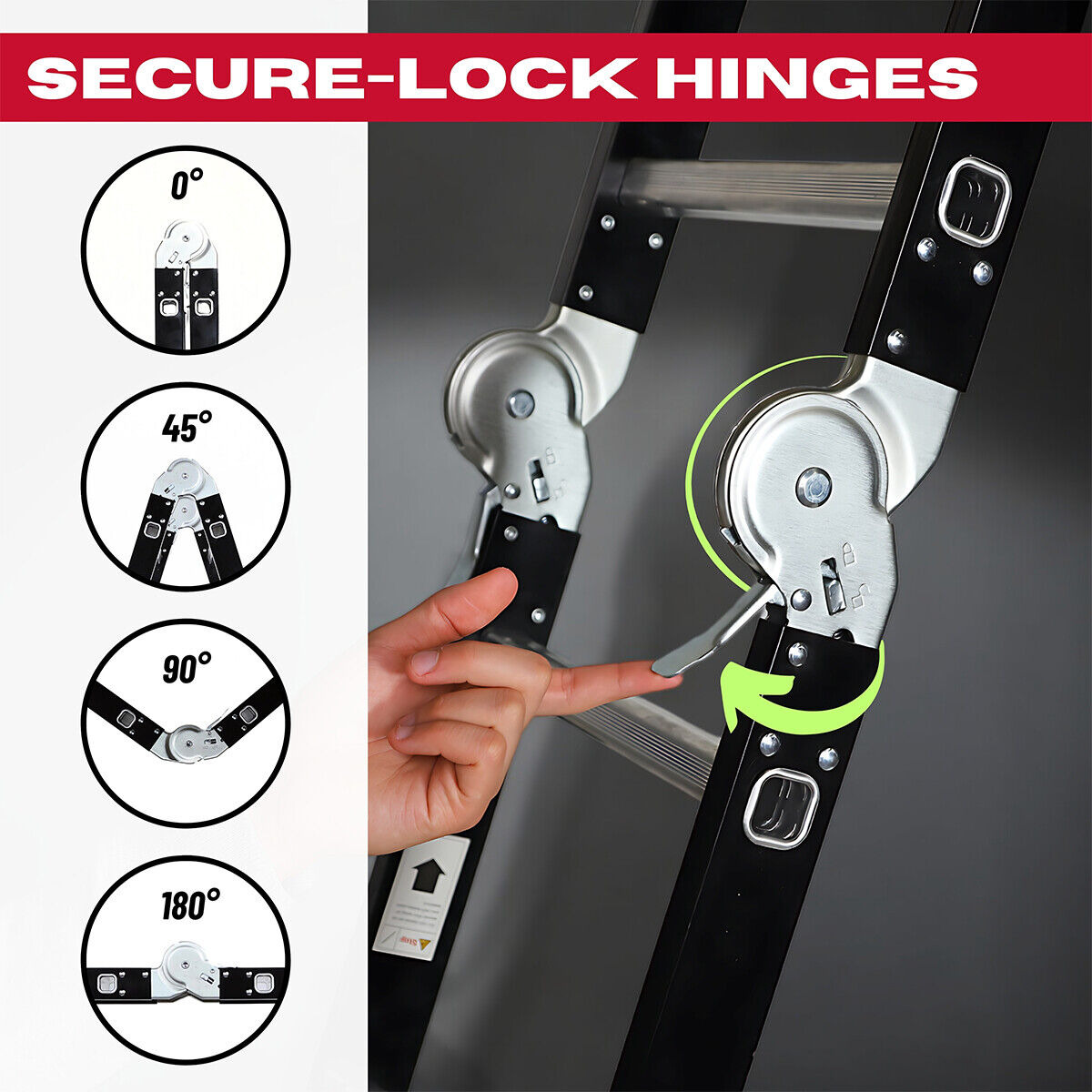 Connected by six security locks, which can be opened and locked for changing the shape of the ladder easily