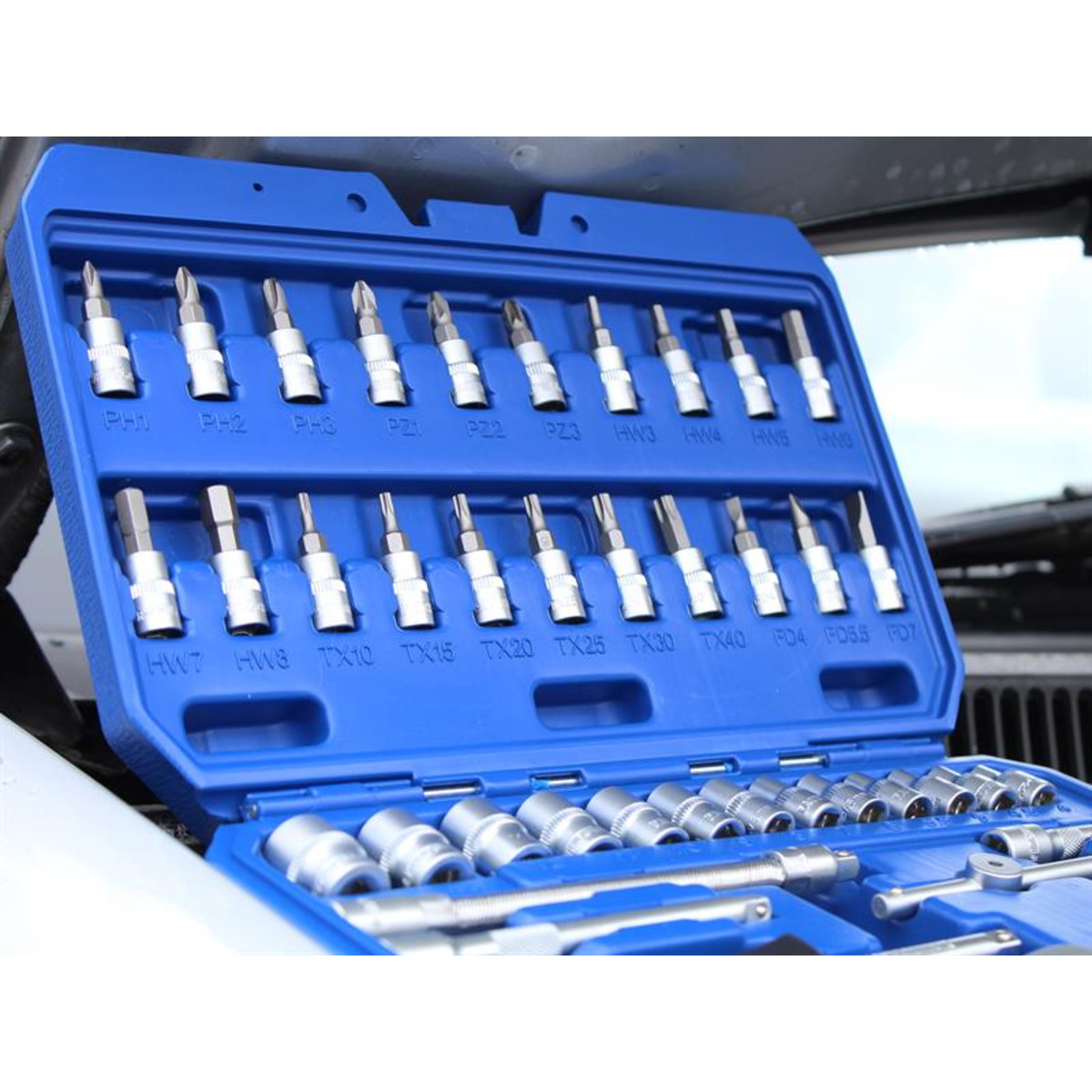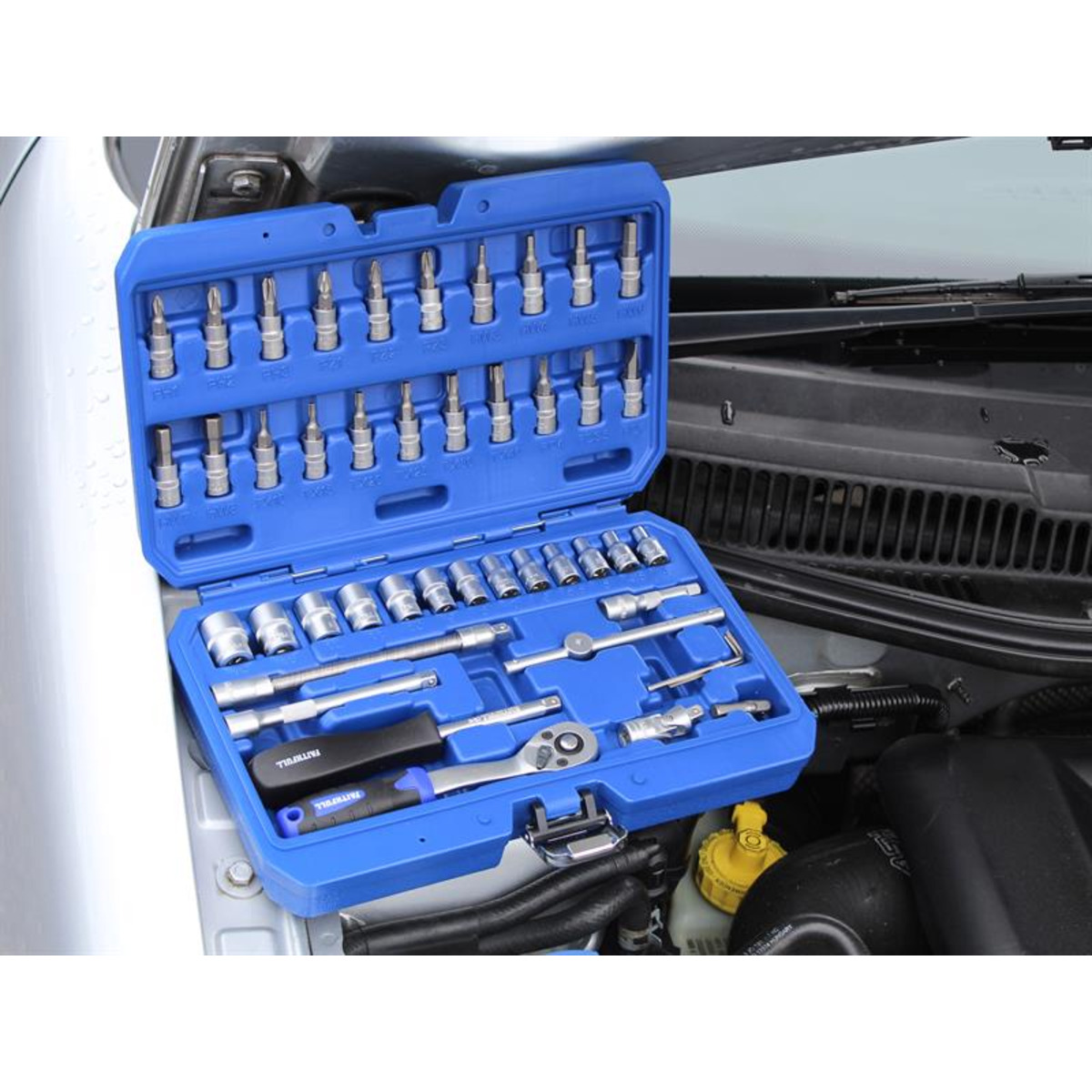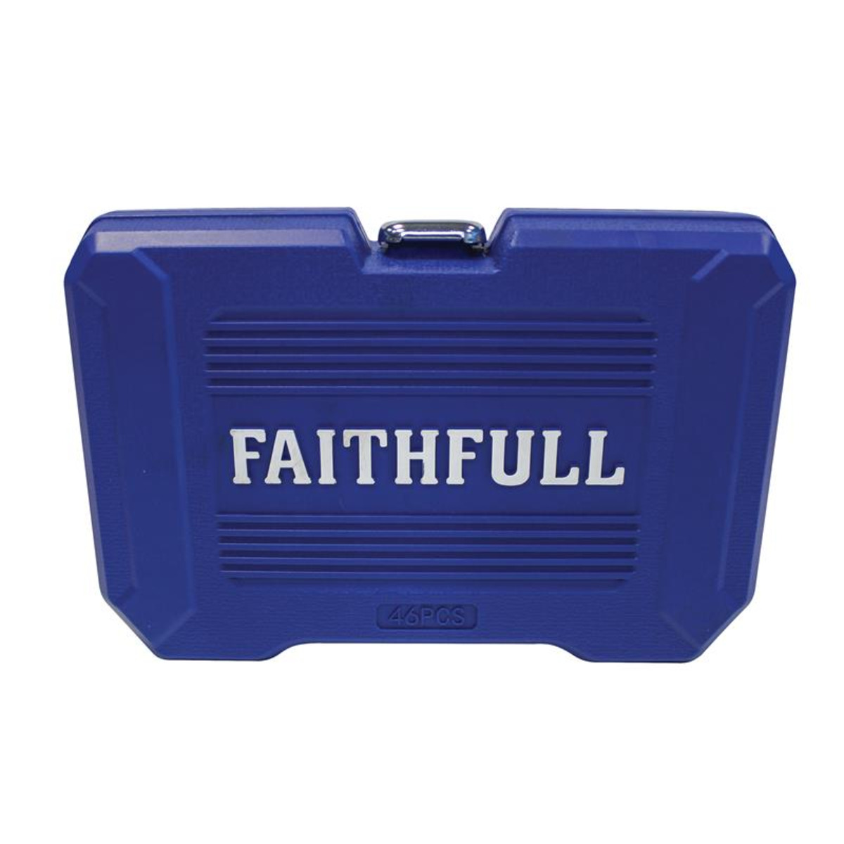 The Faithfull 46 Piece 1/4in Square Drive Socket Set includes a selection of chrome vanadium hexagonal sockets and popular accessories, and features a 72 tooth, smooth action, soft grip ratchet handle with a quick-release mechanism.