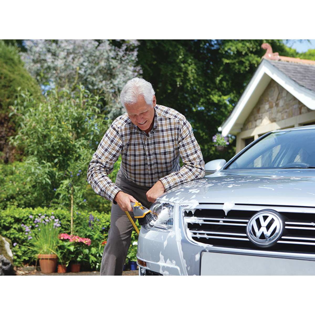 This Hozelock Jet brush is specially designed for cleaning family-size cars and motorbikes. It has a rinsing jet that can be turned on or off and flow control from 100% to zero. The brush is through flow, and clean water is constantly jetted through the brush bristles. Its Quick Connect feature allows rapid connection to the Hozelock system. It has an integral detergent tank with a selector from no soap to maximum soaping.