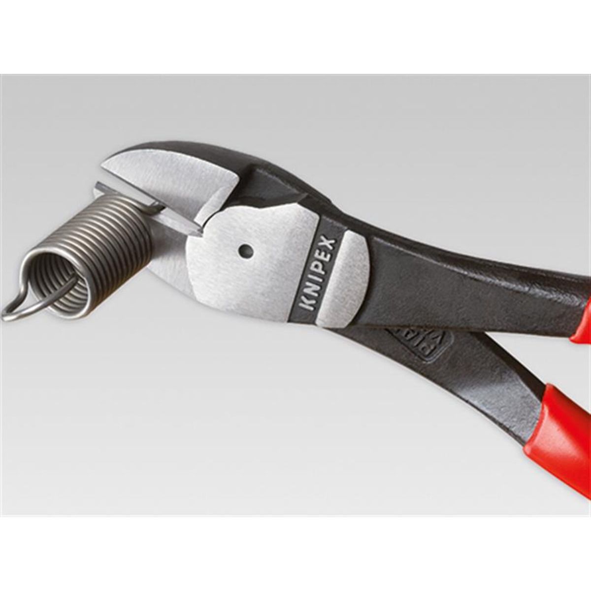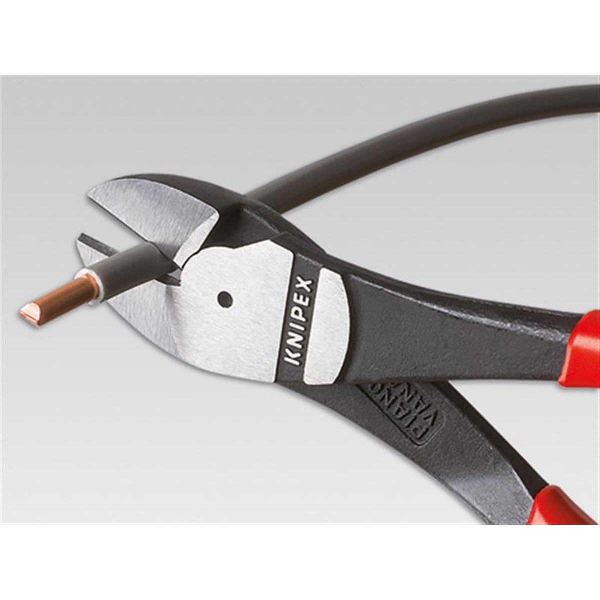 Knipex 74 01 Series High Leverage Diagonal Cutters for very tough, continuous use. Made from chrome vanadium, heavy-duty steel, forged, multi stage oil-hardened. The precision cutting edges additionally induction-hardened (cutting edge hardness approx. 64 HRC), for all sorts of wire including piano wire. Fitted with ergonomically plastic coated styled handles for added grip and comfort. They offer high cutting performance with minimum effort due to optimum coordination of the cutting edge angle and transmission ratio.