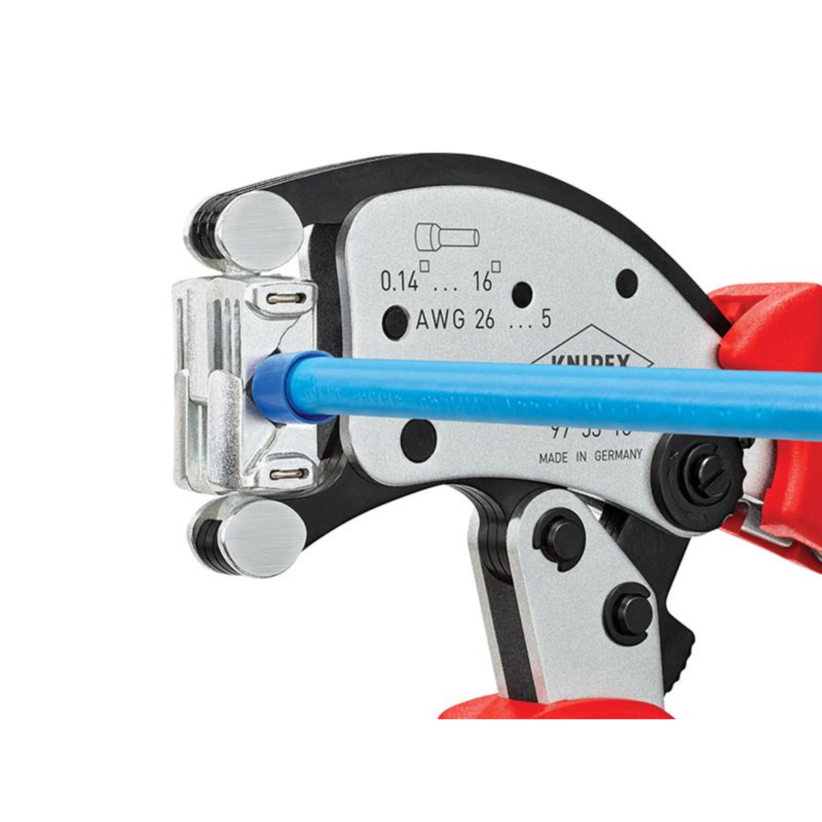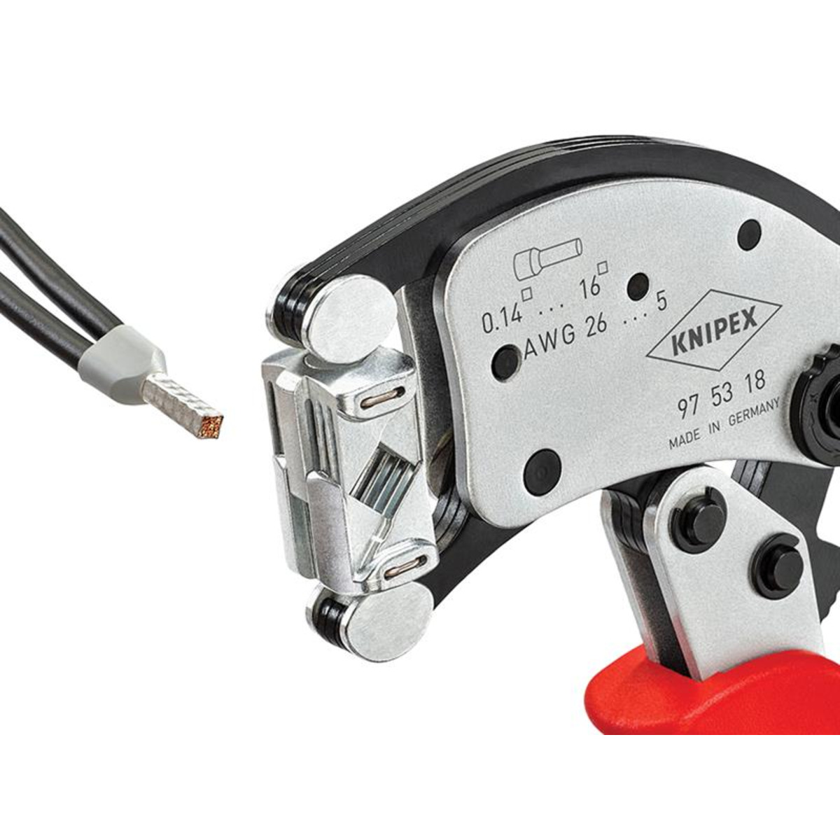 Knipex Twistor16® Self-Adjusting Pliers for crimping wire end sleeves according to DIN 46228 parts 1 + 4. Its square crimp profile has a high-capacity range of 0.14 to 16mm². The 360° rotatable crimping die has 8 tactile locking positions. Self-adjustment to the desired size of wire end sleeve. No crimping errors due to using the wrong crimping die or to an incorrect setting.