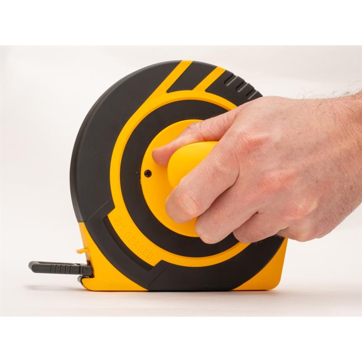 The Roughneck® Closed Long Tape features double-injected ABS housing with tough TPR casing to provide outstanding protection and durability. Wide, easy to read, fibreglass blade with a blade guard coating for protection. Geared mechanism with 3:1 retrieve ratio for fast and smooth blade retraction. Turning up to 1.3m in just 1 rotation, reducing time and effort. Innovative handle drive release mechanism prevents handle rotation when drawing tape. Unique, ergonomic one-hand grip vastly improves handling and comfort.