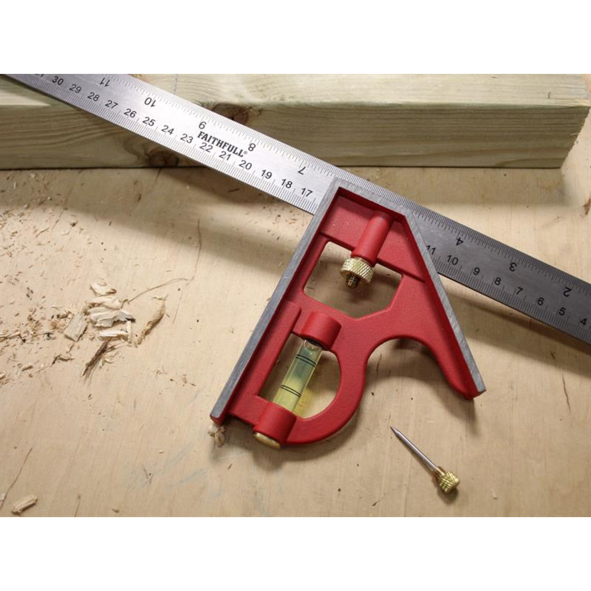 Multipurpose Combination Square for use in both wood and metalworking applications. Each square features a high quality cast and machined sliding stock, fitted with a stainless steel rule engraved with both imperial and metric graduations, a spirit level and marking scribe. The Faithfull combination square has at least 10 different uses including:- Measuring rule with metric and imperial scale, 90° inside square, 90° outside square, 135° inside square, 45° inside square, horizontal level, vertical level, T-square slide, marking gauge and depth gauge.