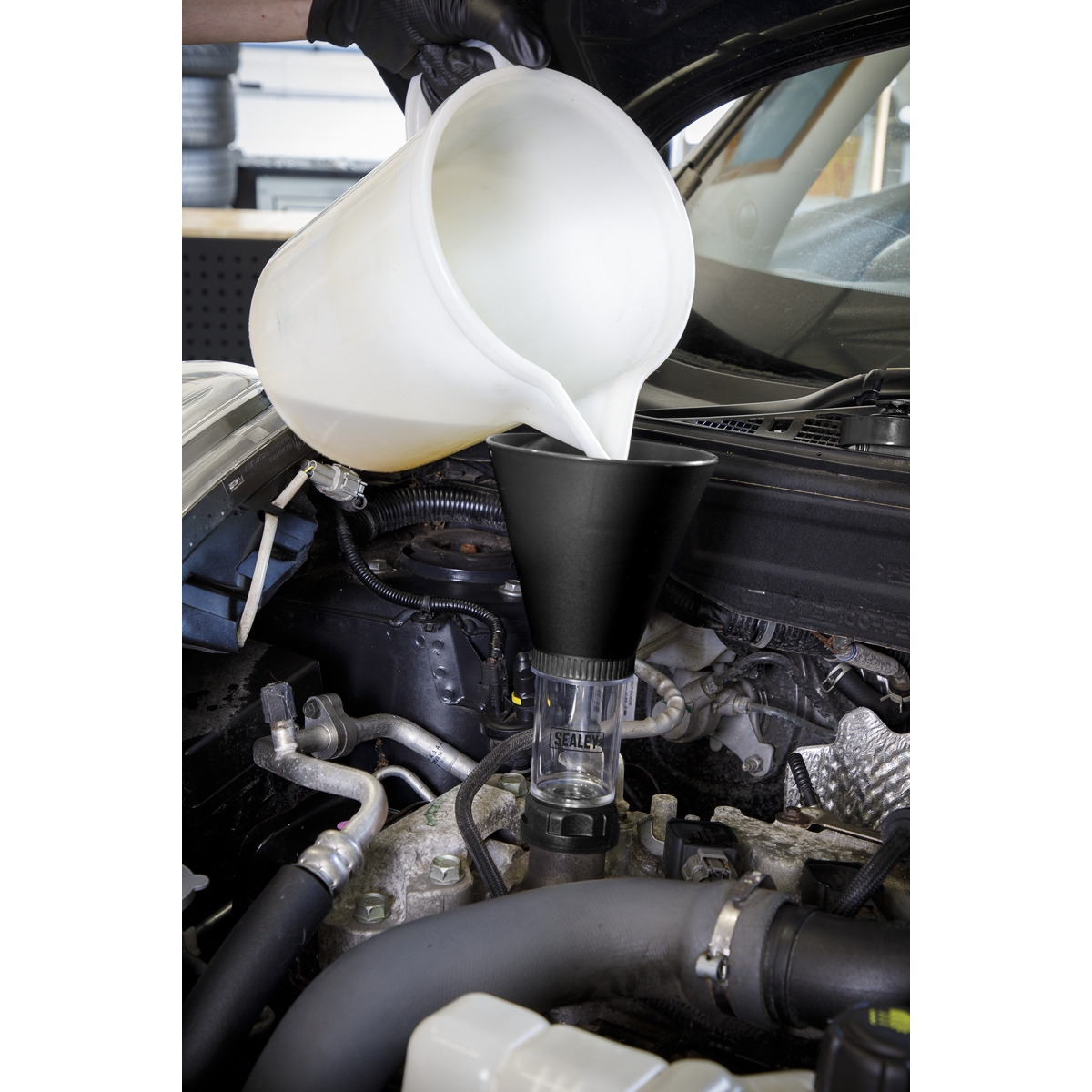 Fastens and seals into the engine filler with two manufacturer specific adaptors. Covering a large proportion of modern vehicles for both Renault and Nissan. Hands-free operation with no mess or spills. See instructions on www.sealey.co.uk for complete list of vehicle applications.