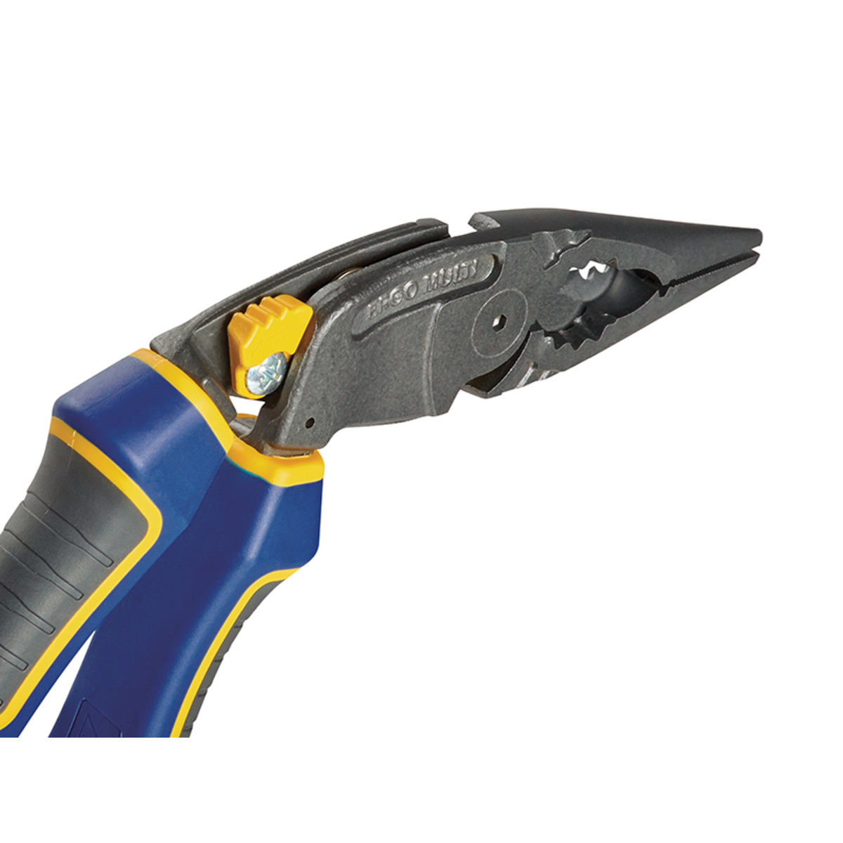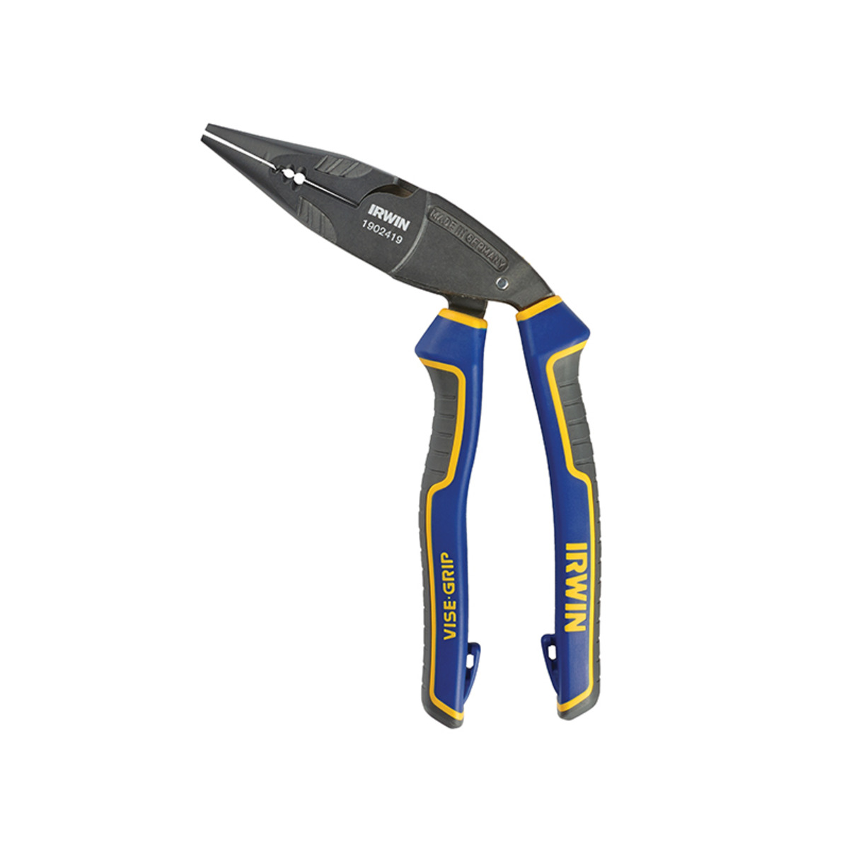 The IRWIN® Vise-Grip® ErgoMulti Long Nose Pliers have a 62° ergonomic angled head for reduced wrist strain and are constructed of high-quality steel. They have been specially coated for superior rust-resistance and longer tool life. The induction-hardened cutting edges are durable enough to cut ACSR, nails, screws and even piano wire without damaging the cutting edge. There is also a built-in wire stripper, that strips 12AWG and 14AWG (solid) wire.