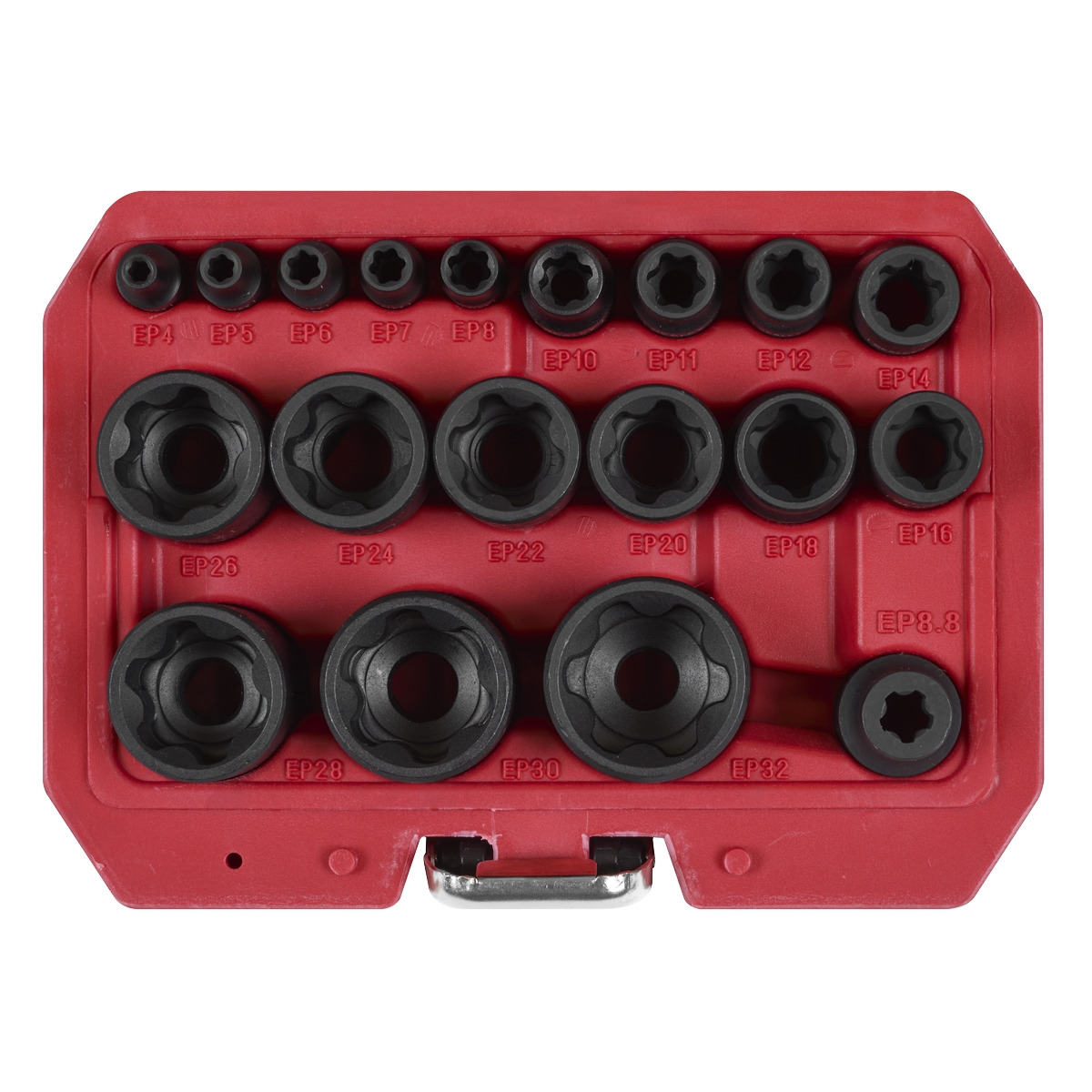 EXTERNAL TRX-P* SOCKETS – For added torque, found on many specialist vehicle applications including automatic gearboxes and head bolts. CHROME VANADIUM STEEL SOCKETS – Drop-forged and heat treated for strength and durability. IMPACT GRADE – For use with any impact tool. CHEMICALLY BLACKENED PHOSPHATE FINISH – For added corrosion resistance. SOCKET SIZES - 1/4"Sq Drive; EP4, 5, 6, 7, 8, 3/8"Sq Drive; EP10, 11, 12, 14, 16, 1/2"Sq Drive; EP18, 20, 22, 24, 26, 28, 30, 32. SET INCLUDES - 1/2"Sq Drive 5-point EP8.8 socket, specially designed for battery pack removal on Tesla. STORAGE CASE – Keeps everything in one convenient place.