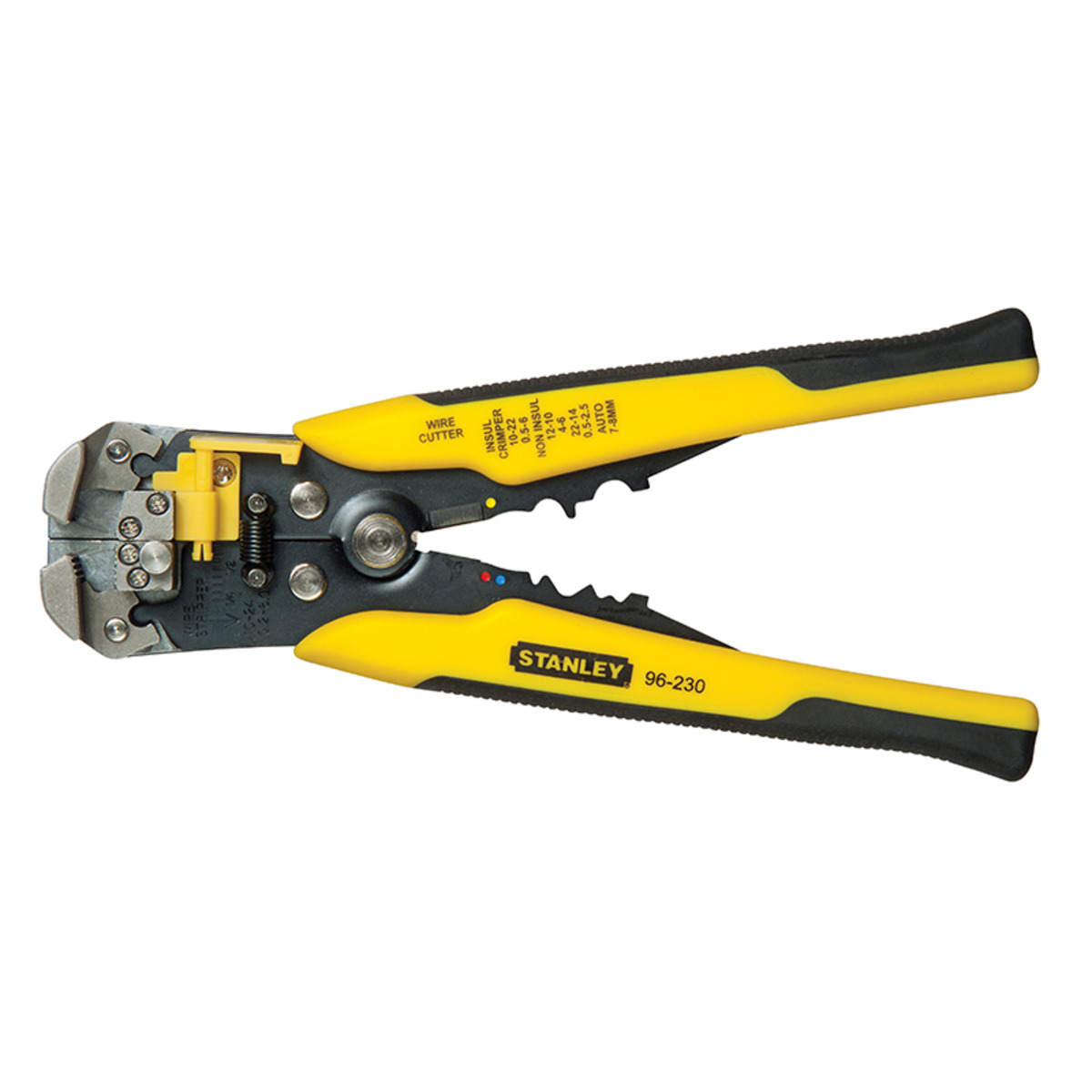 This Stanley FatMax® automatic, spring loaded Wire Stripping Plier strips inner and outer sheaths on wires and cables 0.2-6mm. The pliers have crimping capability and are colour coded for crimps on common insulated and non insulated terminals 1.5-6mm. In addition, they also have an integrated wire cutter.