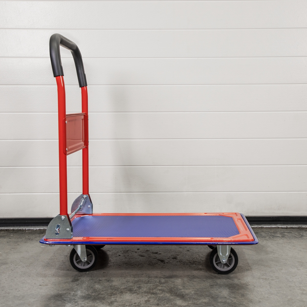 Rigid platform truck features rubberised deck and bumper strip. Platform Size: 725 x 465mm. Handles fold flat for ease of storage. Suitable for a variety of warehouse, office and domestic applications.