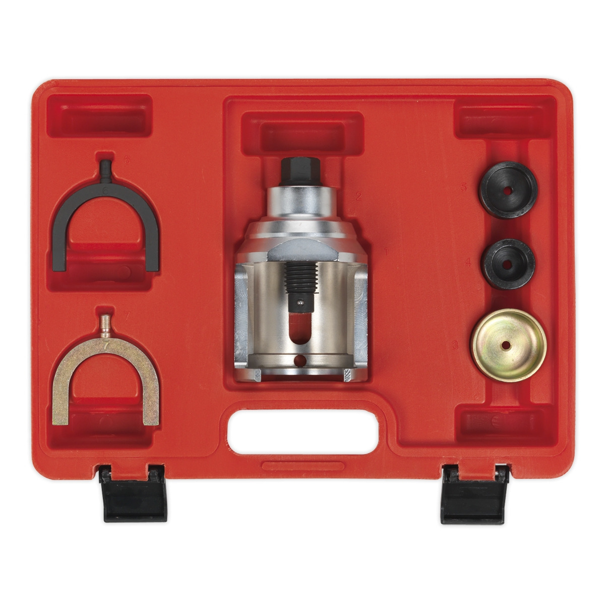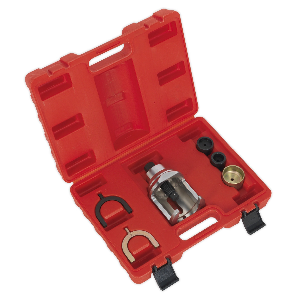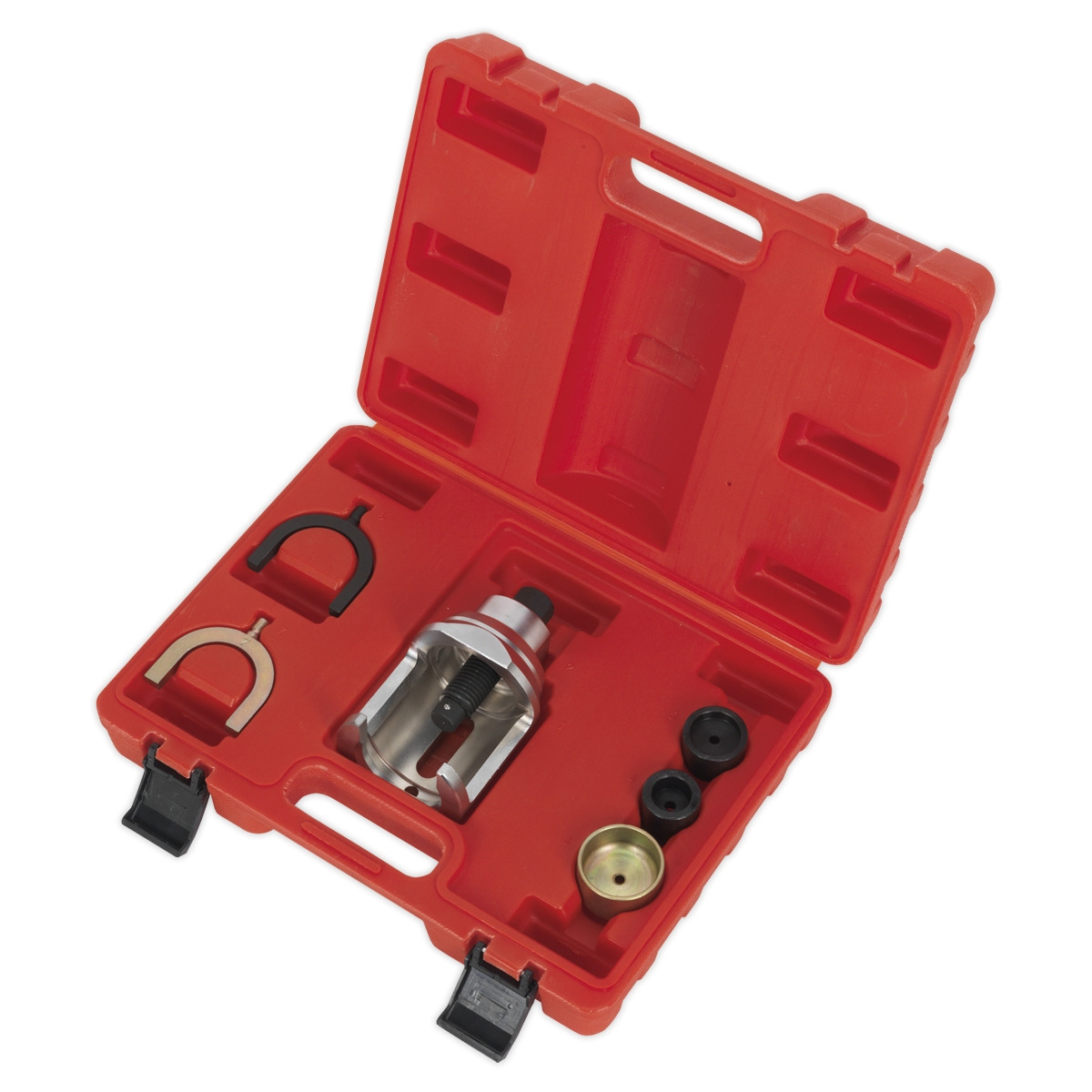 Suitable for removing and installing the upper front ball joint in situ without the need to disassemble. Features a various adaptors used in different combinations for extracting and installing. Supplied in a storage case with each part numbered for simple selection.