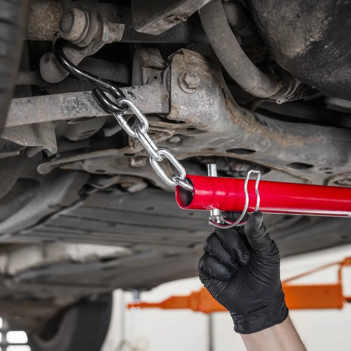 WIDE USE APPLICATIONS - Designed to pull and hold down the lower suspension arm to allow for separation of the hub from the lower arms, lower ball joints or suspension struts from the hub. HANDS-FREE - Designed to be hands-free to allow for safer and easier operation. PREVENTS DAMAGE - Prevents damage to ball joints and drive shaft sleeves. ADJUSTABLE CLAMPING - Offers versatile clamping heights to suit applications in most cars and light commercial vehicles. Adjustable from 65 to 265mm. DURABLE - Manufactured from robust steel for strength and durability. INCLUDES CHAIN - 600mm chain with hook included. LARGE LOAD CAPACITY - Maximum load 181kg.