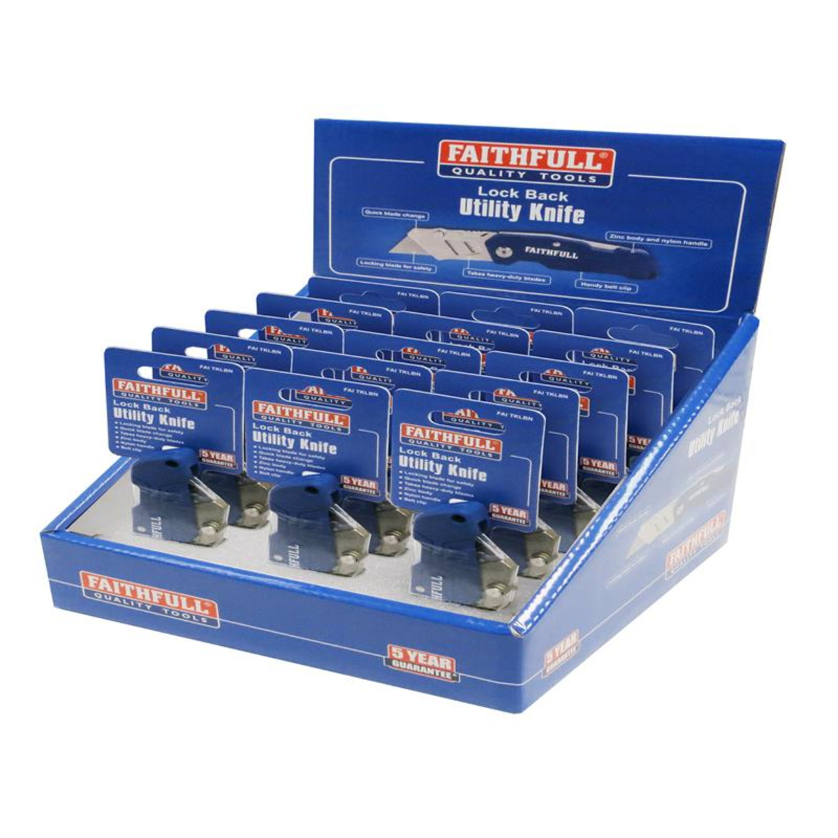 The Faithfull Lock Back Utility Knife features a lightweight nylon casing with a durable metal folding mechanism and quick release blade change. The folding blade holder allows the blade to be securely stored inside the body of the knife but can be easily pulled open and locked in place ready for use. After use a simple press on the release lever allows the blade to be returned into the body of the knife for safe keeping.