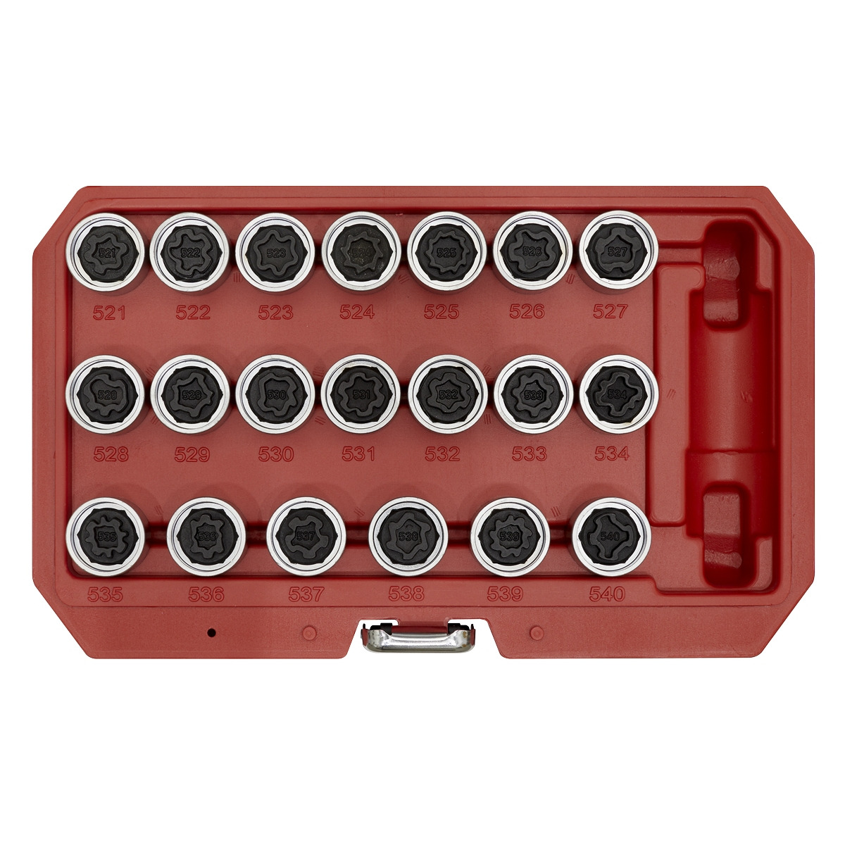 Set of 20 locking keys for the removal of security locking wheel nuts on VAG vehicles. Special shape for ANTI-THEFT wheel nuts. Key Drive: 17mm Hex. Contents: Keys; #521, #522, #523, #524, #525, #526, #527, #528, #529, #530, #531, #532, #533, #534, #535, #536, #537, #538, #539, #540. Applications; VW Beetle, EOS, Jetta, Passat, Tiguan, Touran, Scirocco, Sharan and Golf/GTI's in the production year 2006on. For distribution to bona fide vehicle dealers and repair centres only.