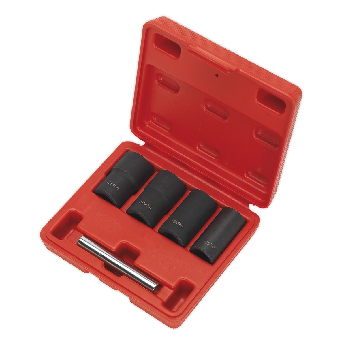 Forged Chrome Molybdenum steel 1/2"Sq drive sockets for removal of wheel locking nuts when the key is not available. May also be used on fixings too damaged or corroded for standard sockets. Set includes drift to aid removal of fixing from socket. Suitable for use with impact wrenches. Sockets: 17, 19, 21, 22mm. For distribution to bona fide vehicle dealers and repair centres only. Lifetime guarantee*.