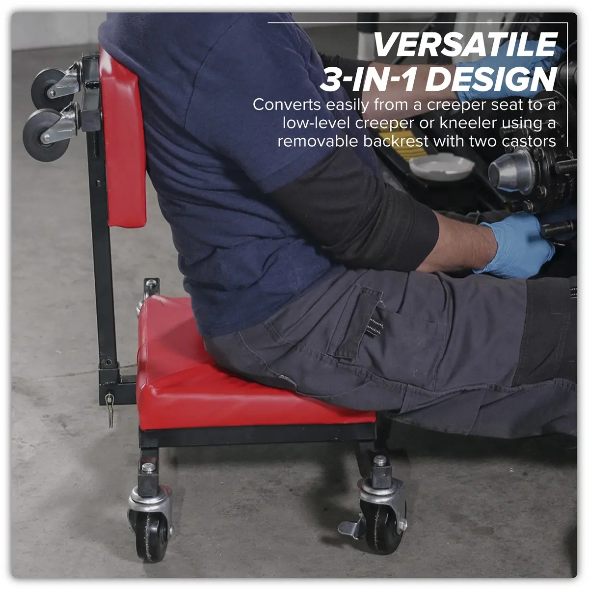 - Easily converts from creeper seat to a traditional low level creeper and to a kneeler, thanks to a removable back rest fitted with two castors.