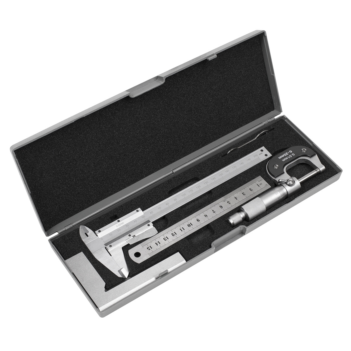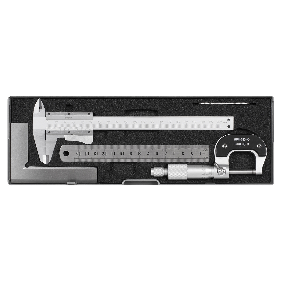 - Contents: 200mm Vernier Caliper, 0-25mm Micrometer, 100 x 70mm Bevelled Edge Square, 150mm(6") Stainless Steel Rule.