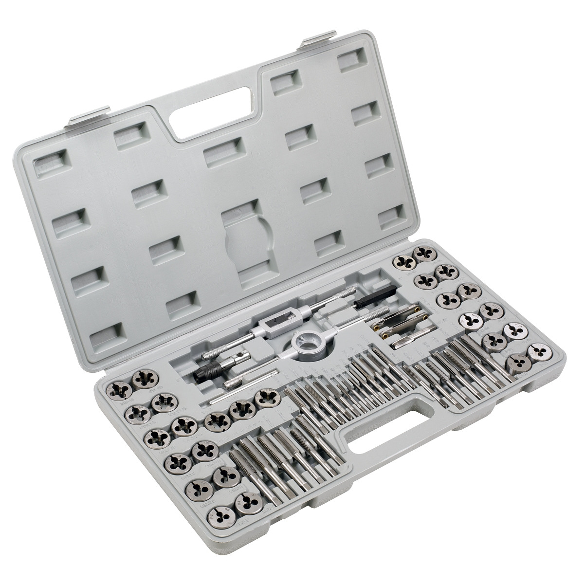 - Contents: Taps & Dies; 3 x 0.5, 4 x 0.7, 5 x 0.8, 6 x 1.0, 7 x 1.0, 8 x 1.25, 9 x 1.25, 10 x 1.5, 10 ? 1, 12 ? 1.75mm, 4-40, 6-32, 8-32, 10-24, 10-32, 12-24, 1/4"-20, 1/4"-28, 5/16"-18, 5/16"-24, 3/8"-16, 3/8"-24, 7/16"-14, 7/16"-20, 1/2"-13, 1/2"-20, 1/8"-27, Die Handle, Double End Tap Wrench, T-Handled Tap Wrench, Metric Screw Pitch Gauge, Imperial Screw Pitch Gauge and slotted 5mm Screwdriver.