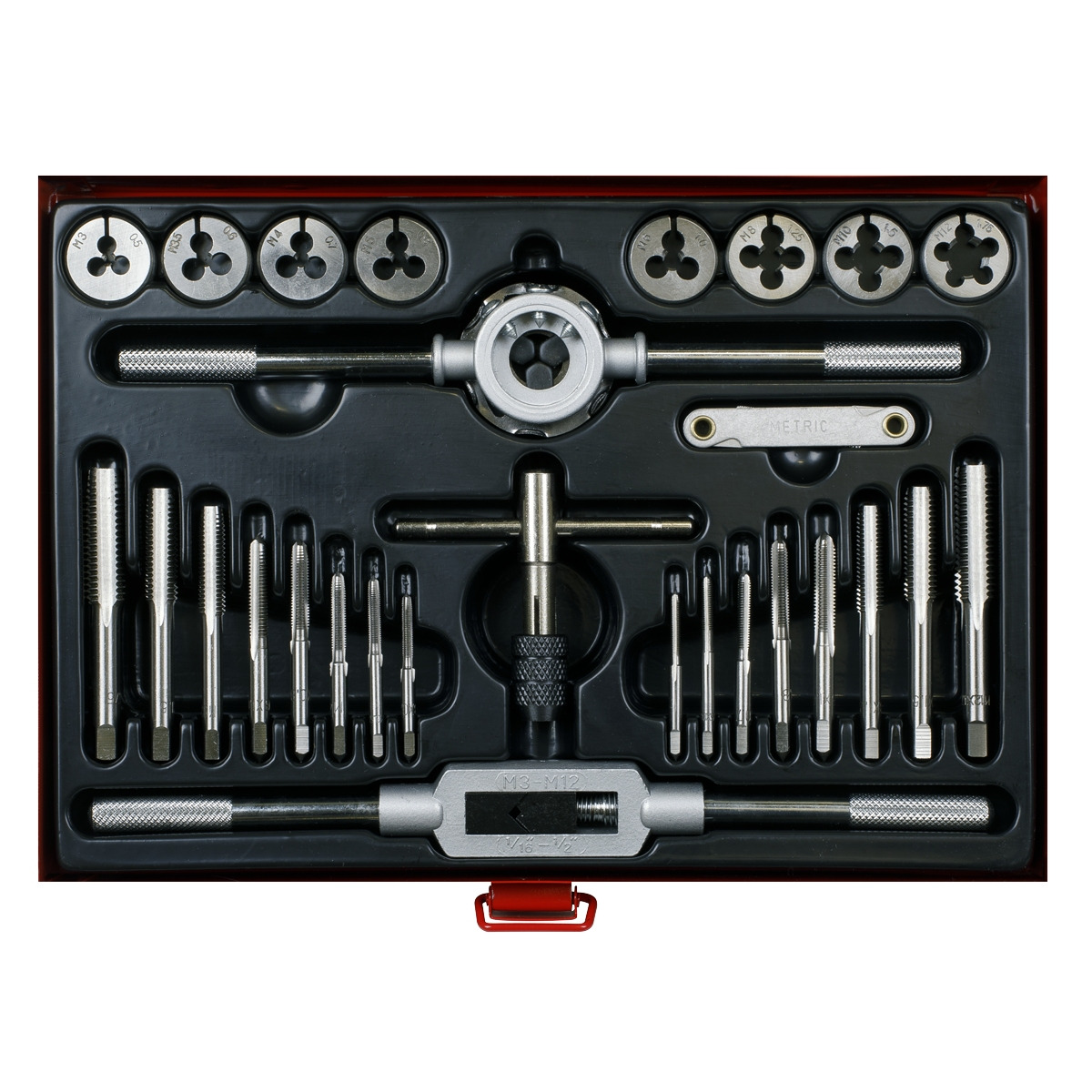 High quality steel taps and dies. Split dies with machined lead-ins for ease of use. Die holder features self-centring mechanism for straight and accurate thread cutting. Set includes intermediate and plug taps, T-handled tap wrench and Metric screw pitch gauge. Sizes: 3-12mm. Supplied in storage case.