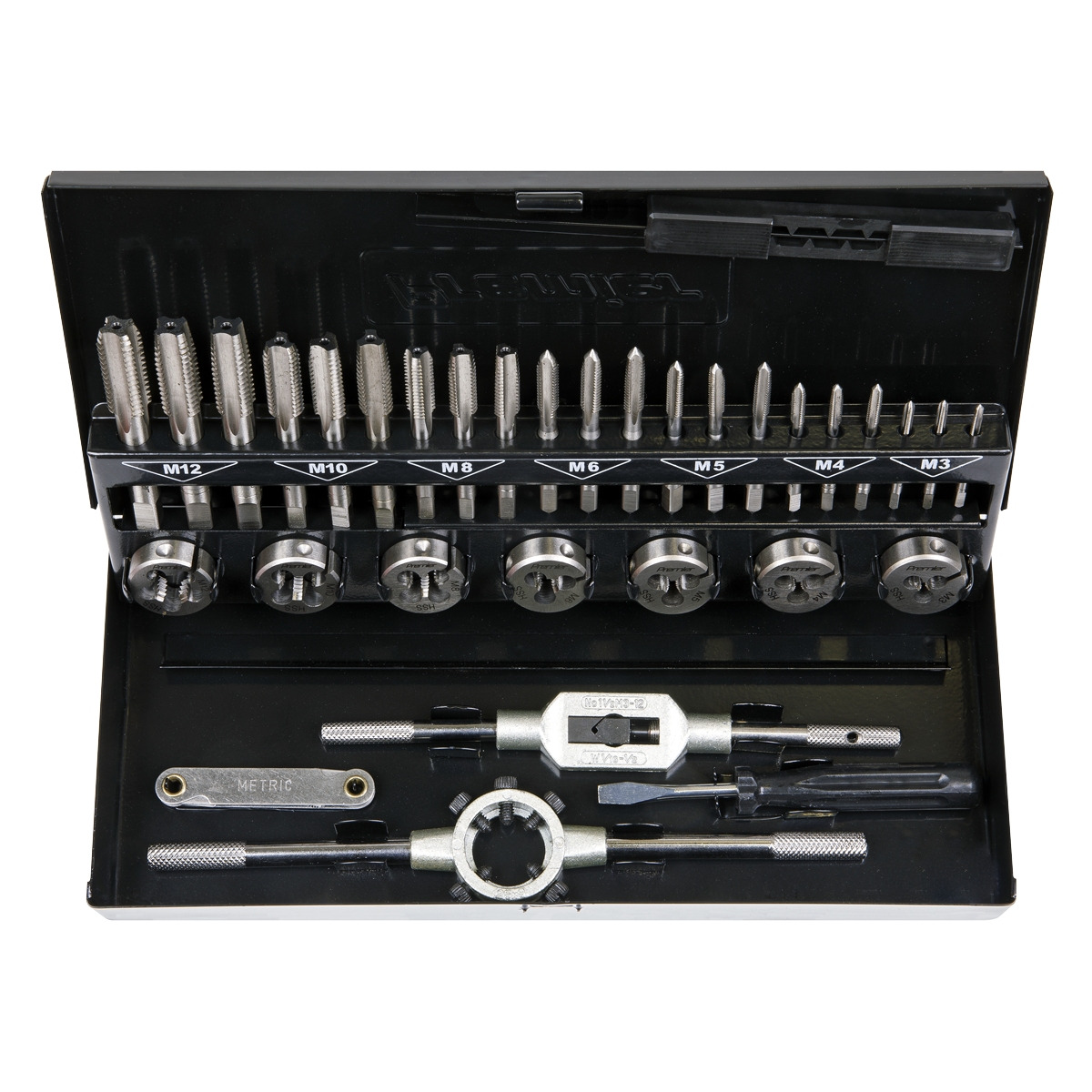 M3 to M12 steel tap and die set manufactured from HSS 4341 steel providing improved cutting performance and longevity. Split dies with machined lead-ins for ease of use. Taps supplied in three types for each size, taper (starting), second tap (intermediate) and plug (bottoming). Matched by equivalent sized dies. Provides all functions required for a professional engineer. Set includes tap wrench, steel die handle, screw pitch gauge and screwdriver. Supplied in metal storage case.