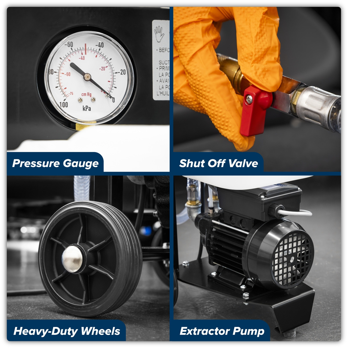 - Mobile oil drainer designed to extract oil via the dipstick tube.