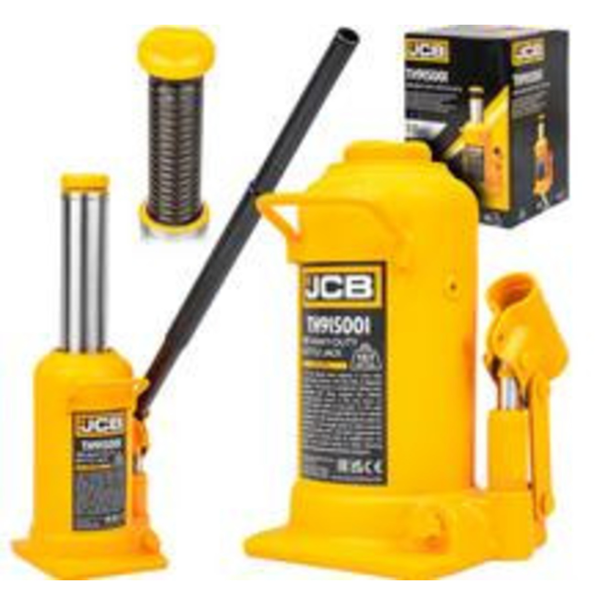 The JCB-TH915001 is a heavy-duty, portable and powerful hydraulic automotive bottle jack designed to lift and provide dependable support for heavy commercial vehicles, machinery and construction objects up to 15 tonnes in weight. Ideal for use for industrial automotive, construction and agriculture jobs, this JCB hydraulic bottle jack is capable of raising and supporting heavy-duty commercial vehicles, machinery and materials up to a maximum of 508mm from the ground.The JCB-TH915001 comes equipped with an adjustable height screw, which can be extended up to 113mm in height depending on the desired application.For quick and efficient pumping, the JCB-TH915001 is fitted with a zinc plated long handle, while its built-in safety valve prevents the ram from being overextended and causing damage to the cylinder.Made for hard work and built to last, this durable JCB bottle jack utilises a welded construction design to prevent any oil from leaking during operation, as well as an ENP plated ram piston, which prevents the piston from rusting.The JCB-TH915001 bottle jackÂ’s tank is welded to a lightweight forged steel base, which provides further strength and stability to cope with the demands and high pressure of lifting and supporting large volumes of weight for prolonged periods of time.Weighing just 9.87kg, the JCB-TH915001 boasts an impressive power-to-weight ratio and is fitted with a sturdy carry handle, which means it can easily be carried and transported to be used on the go when necessary.Key FeaturesJCB 15 Tonne Heavy-Duty Automotive Hydraulic Bottle Jack15 Tonne Lifting Capacity: Suitable for light commercial vehicles, SUVs, off-road vehicles and construction applications508mm Maximum Height280mm Minimum HeightWelded construction design to prevent any oil from leaking during operationLightweight steel forged base to provide strength and stability to cope with the demands and high pressure of heavy liftingZinc plated long handle creates quick and easy pumpingENP plated ram piston design to prevent the piston from rustingBuilt-in safety valve prevents the ram from being overextended and causing damage to the cylinderSuitable to be used on the move with compact designNet Weight: 9.87kgBacked by a comprehensive 3-year warranty* (1 year Commercial)*3 Year Warranty (Terms Apply)