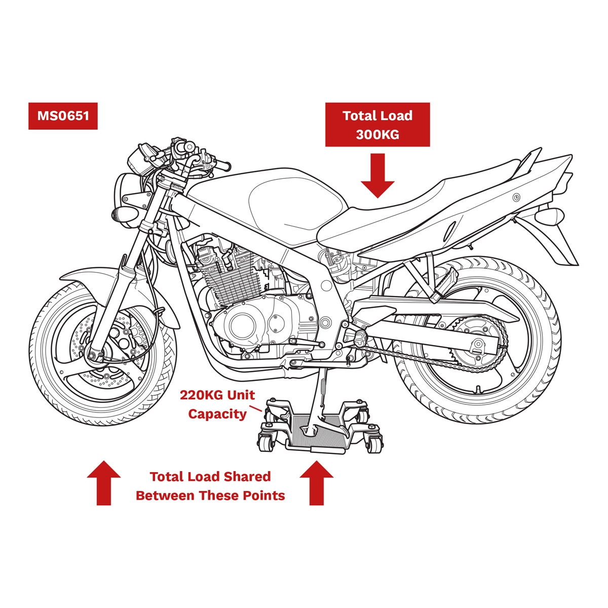 - Use to manoeuvre motorcycles (maximum 300kg dispersed vehicle weight) with centre-stands.