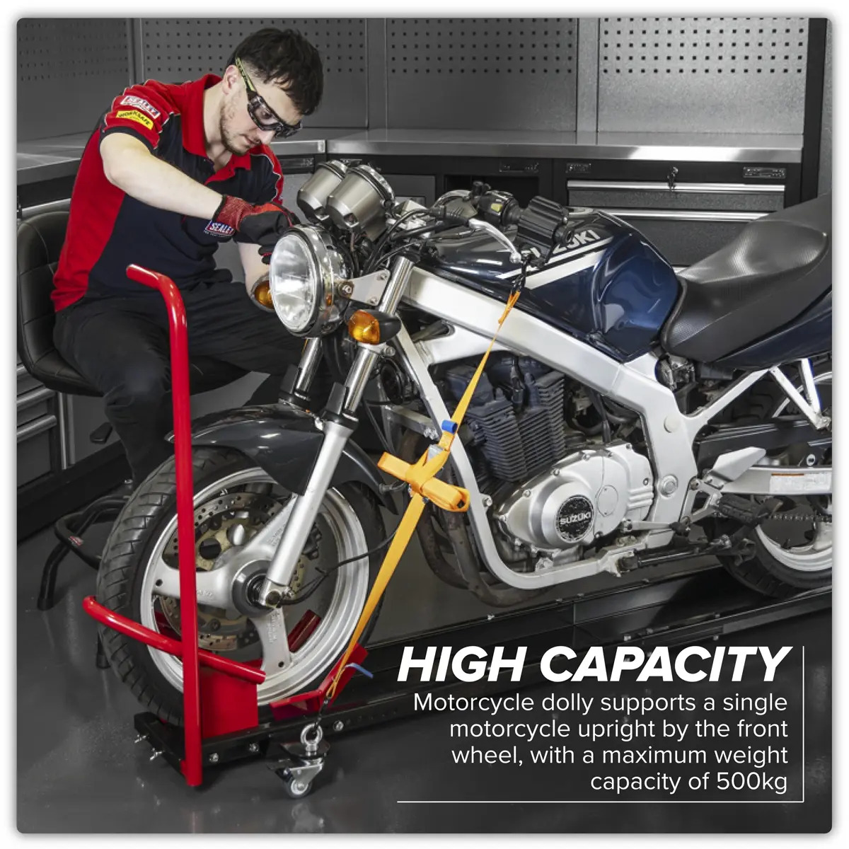 - HIGH CAPACITY - Motorcycle dolly holds a single motorcycle upright by the front wheel, weighing up to 500kg.