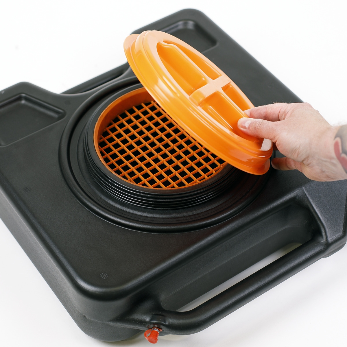 - Features heavy-duty construction with wheeled undercarriage for easier transportation of full drainer.