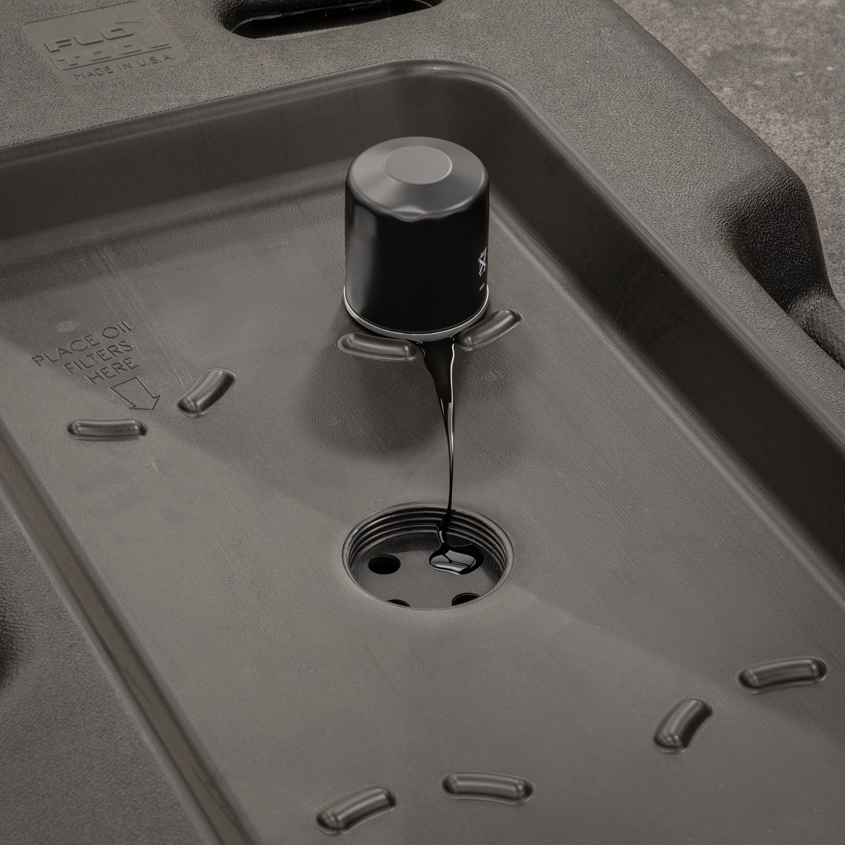 ECO-FRIENDLY - Ensures safe and clean collection, transportation and temporary storage of waste oil. DURABLE & PORTABLE - Features heavy-duty construction with wheeled undercarriage for easier transportation of full drainer. CONVENIENT - Stores flat or in upright position. INCLUDES - Supplied with additional tap for alternative draining method.