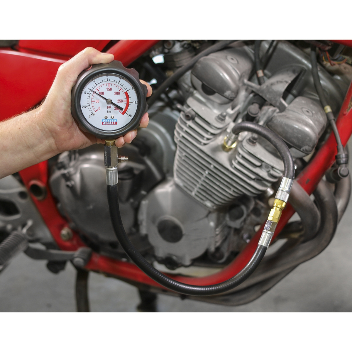 Features 300psi gauge with large rubber bumper. Includes extension for deep-seated plugs and flexible extension hose. Suitable for petrol engines with 10, 12, 14 and 18mm spark plug threads. Supplied in storage case.