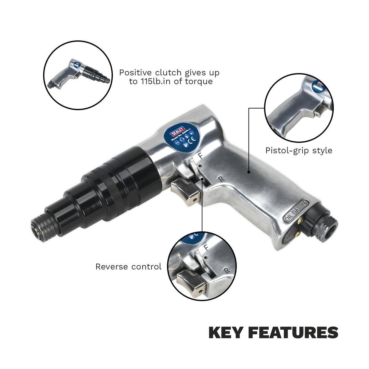 Pistol-grip style, air operated screwdriver with reverse control. Positive clutch gives up to 115lb.in of torque. Suitable for assembly/dismantling and general production work.