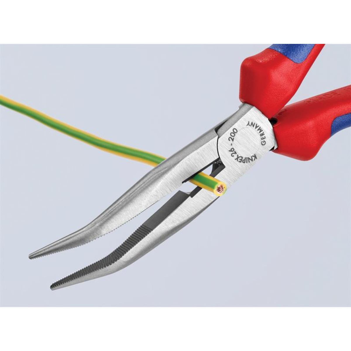 Length: 200mmKnipex 26 Series Bent Snipe Nose Cutting Pliers with long half round jaws and distortion-tolerant, elastic precision tips. The jaws are angled at 40° and are ideal for use on electronic or tight to reach areas on computers, circuitry, or motor vehicles applications. 61HRC.